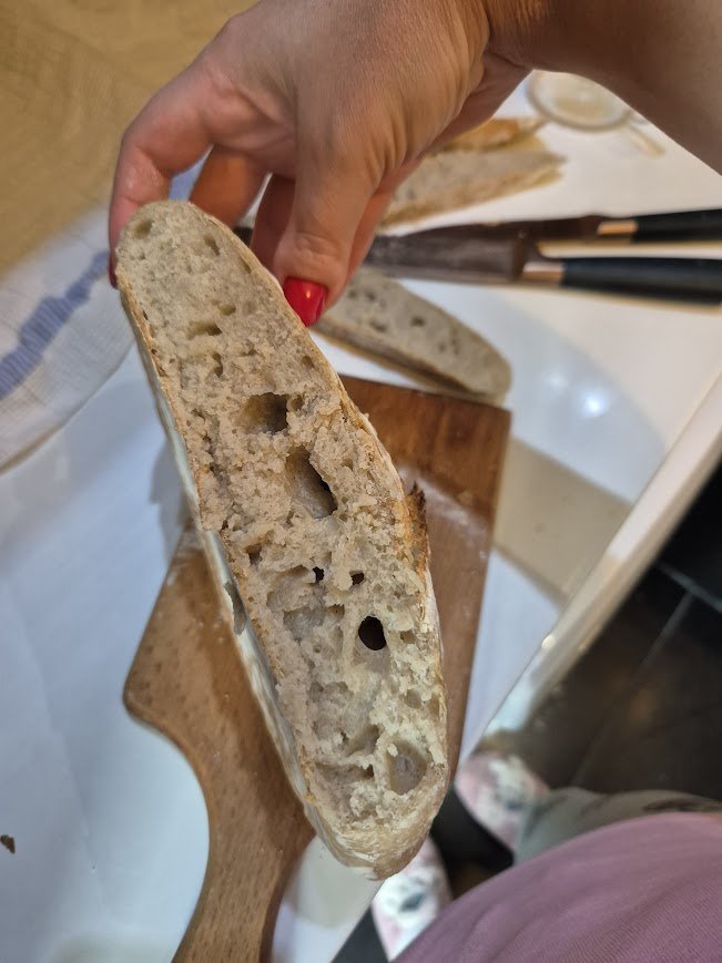 Не знам къде греша, обаче хлябът много се "разтича" и не държи форма. Още при фолдовете тестото става изключително лепкаво и след като втаса много трудно го огормям, за да прибера в хладилник.