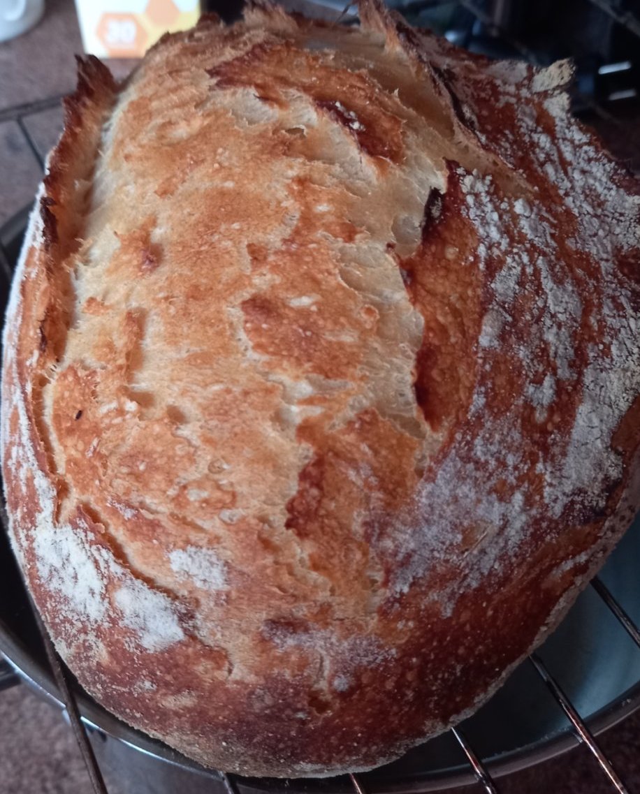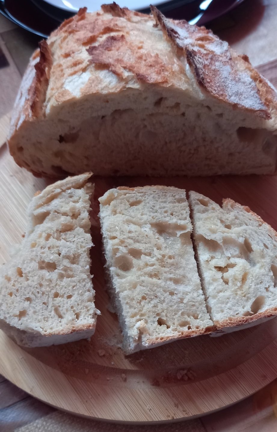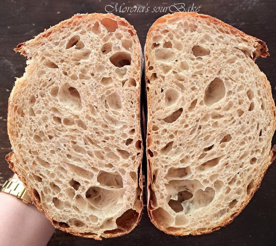 Мдаа, трябва да втасва още, първата ферментация имам предвид, на топло.  Това отваряне говори за недовтасване, има сила  да втасва и затова и толкова отворено.  Simple Smile  И вкусът е по добър при добре втасал и дори леко превтасал хляб.