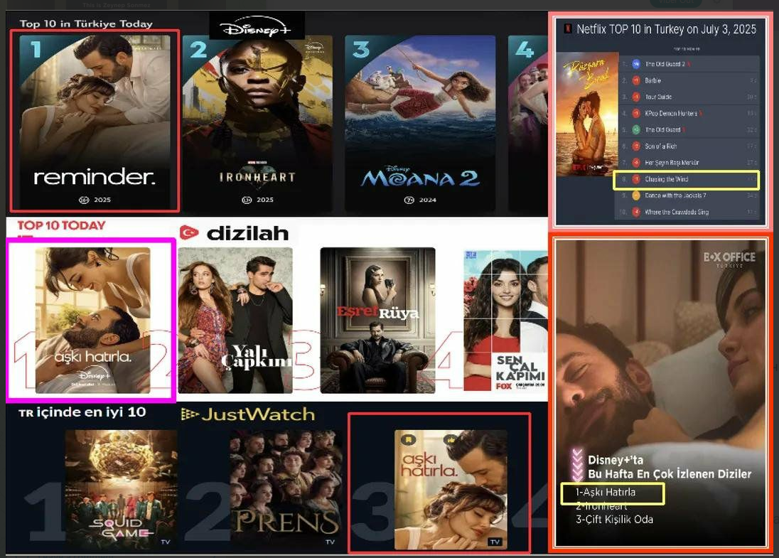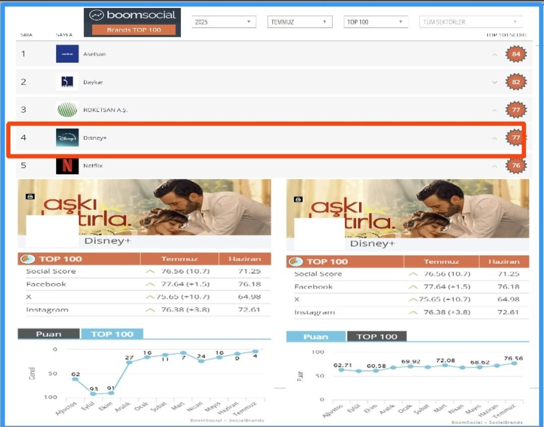 BoomSocial публикува доклада за Топ 100 марки за юли. Disney+ беше класирана на 16-то място във всички сектори през май , но се издигна до 9-то място със началото на PR процеса на сериала Aşkı Hatırla през юни и се издигна до 4-то място през юли с пускането на сериала, увеличавайки взаимодействието.