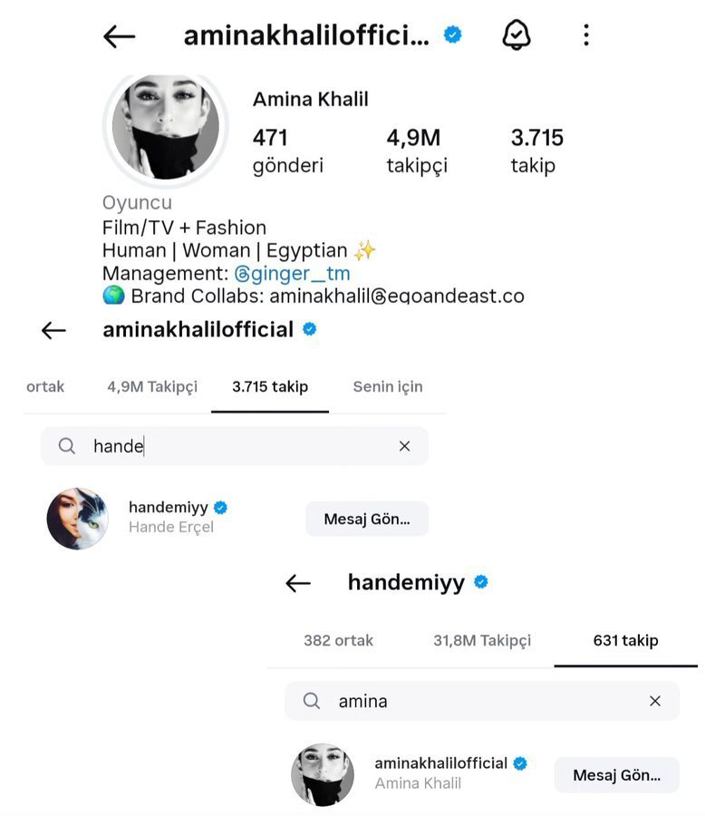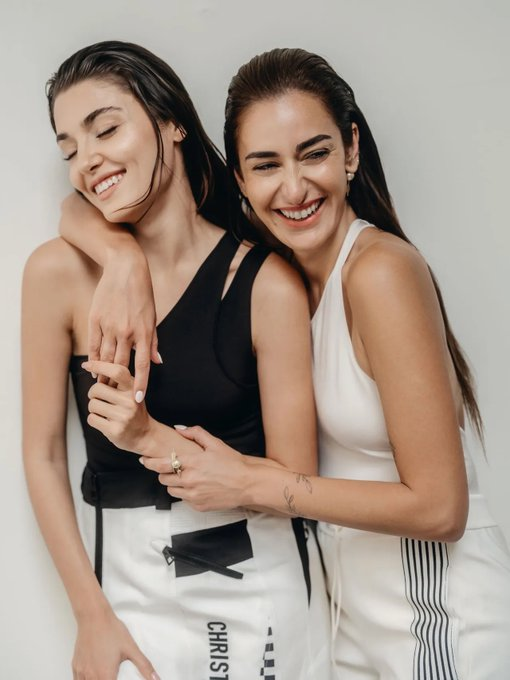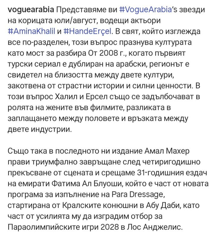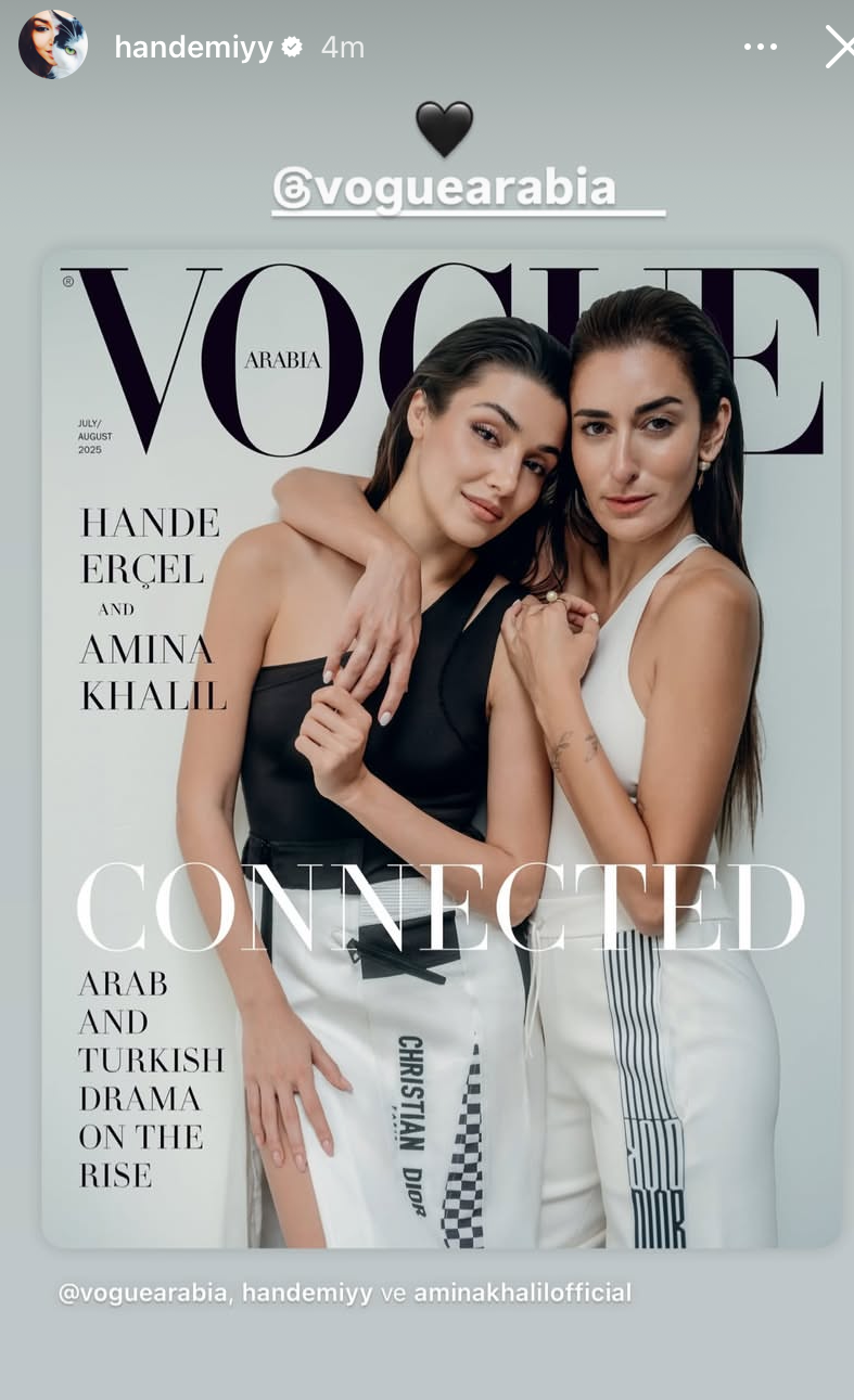 "Амина Халил и Ханде Ерчел на корицата на юлския и августовския брой на Vogue Arabia в специално честване на турската и арабската драма ♨️ и откровена среща събра двете звезди, където те разговаряха за арабското и турското кино и нещата, които всяка от тях обича."