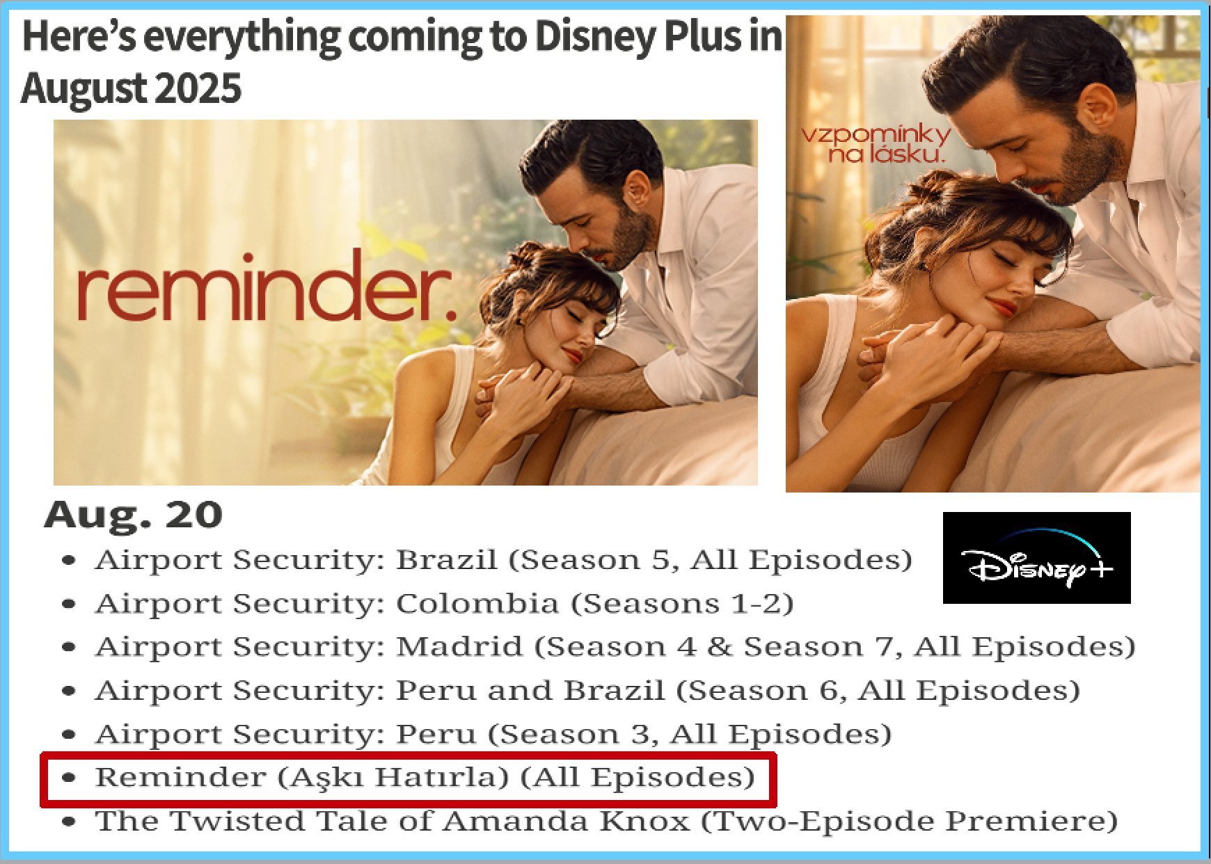 Сериалът #AşkıHatırla (#Напомняне) с участието на #HandeErçel и #BarışArduç беше добавен към календара на Disney+ на 20 август във Великобритания, Канада и много други страни.