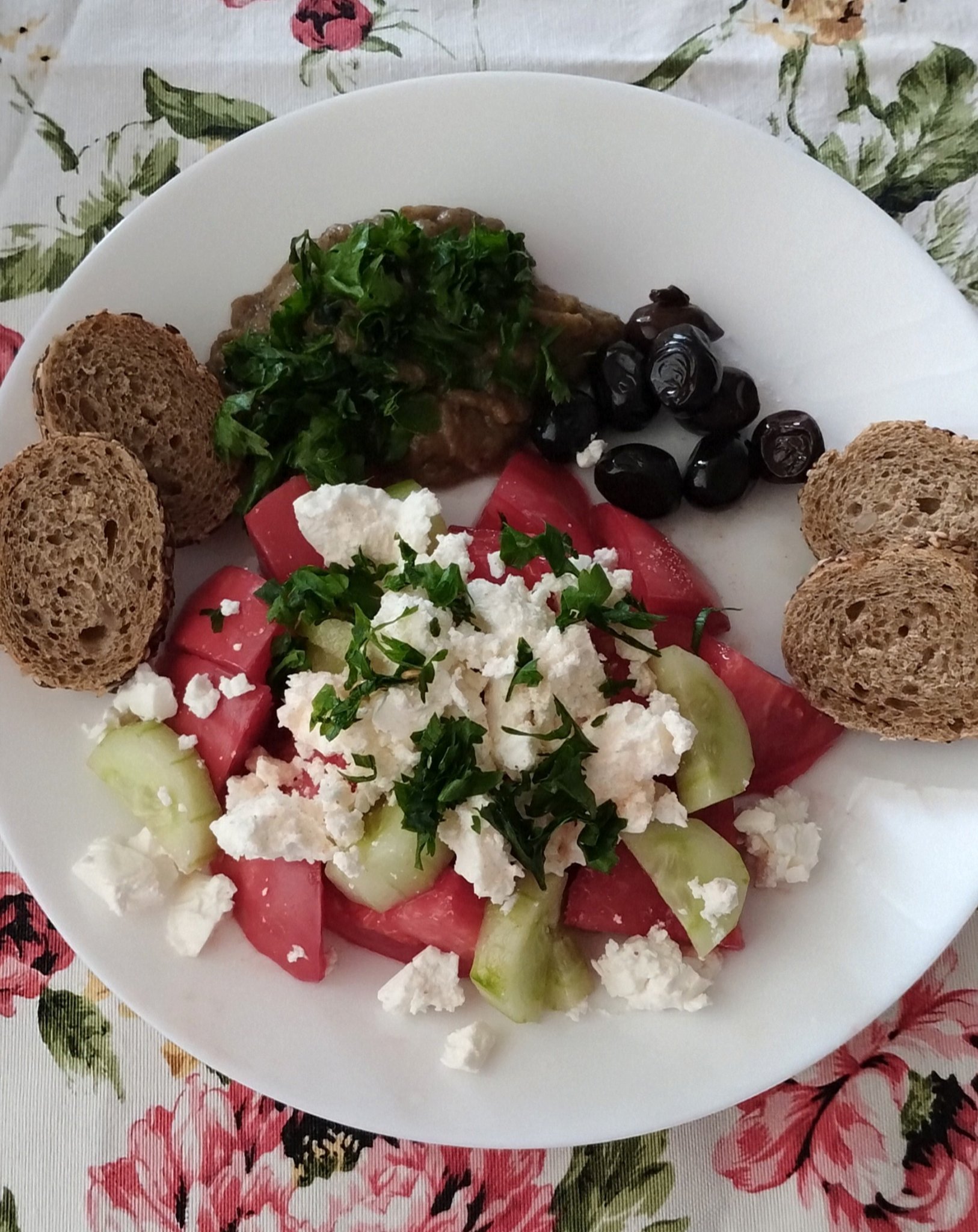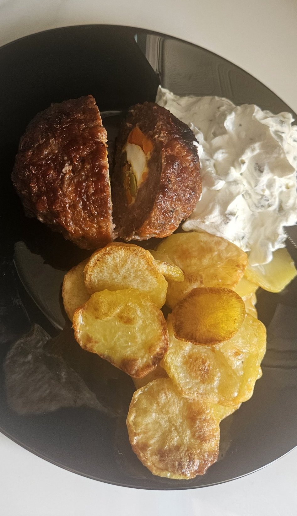 Руладина с телешка кайма, печени картофи и тракийска салата набързо