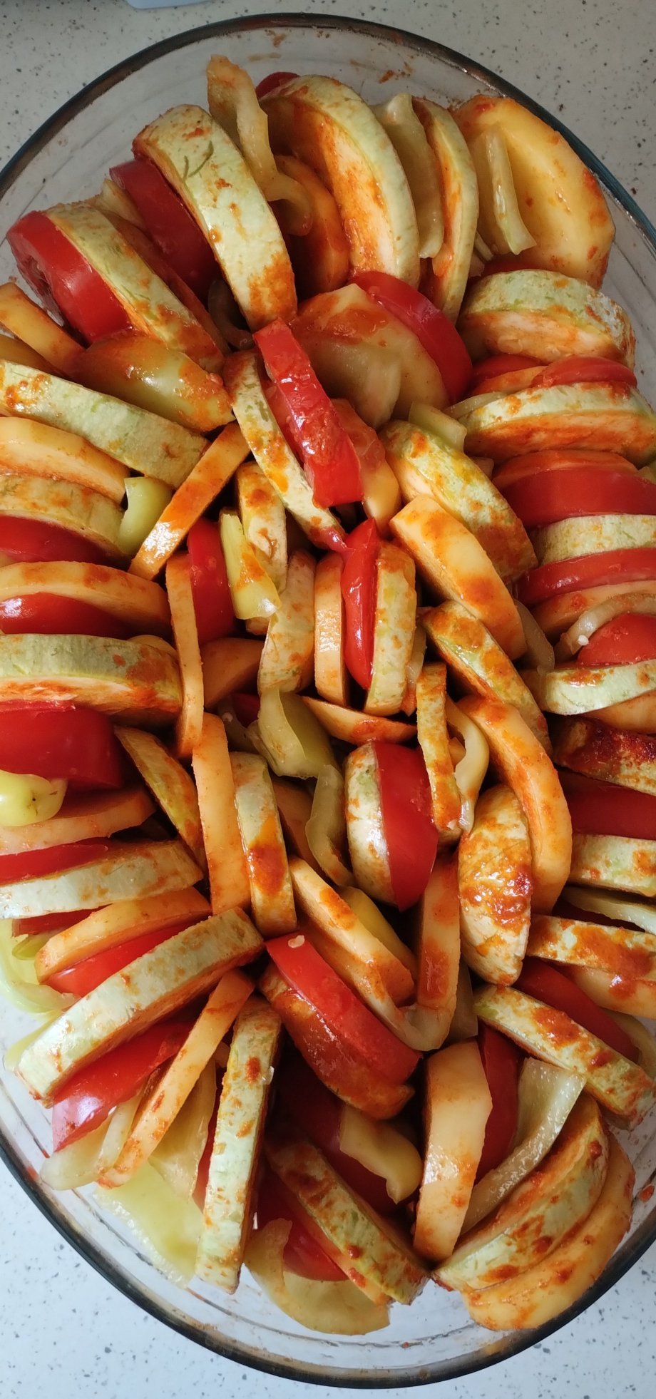 Вечерята остана без снимка - пилешки бутчета с картофи, тиквичка, лук и морков.