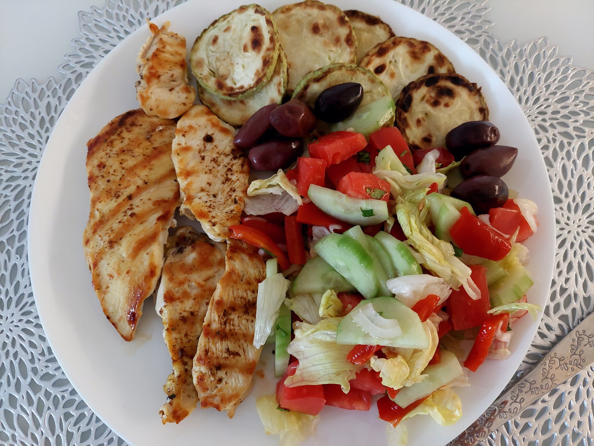 Пилешко на грил тиган  с едро нарязани зеленчуци (тиквичка, патладжан, червени чушки домати) мариновани със зехтин и чесън, запечени на фурна.