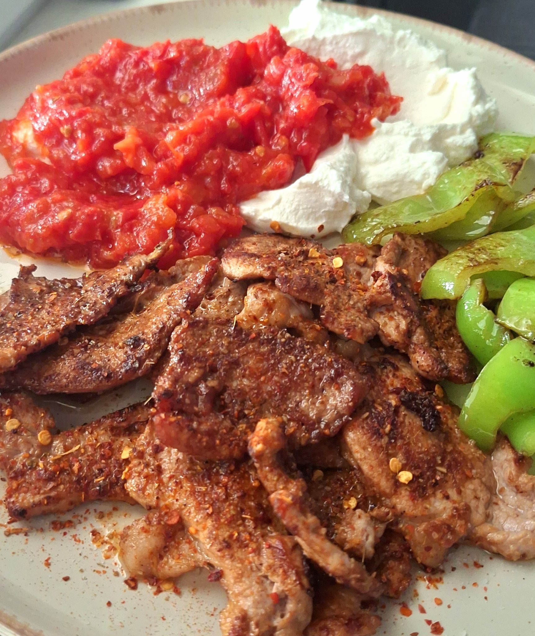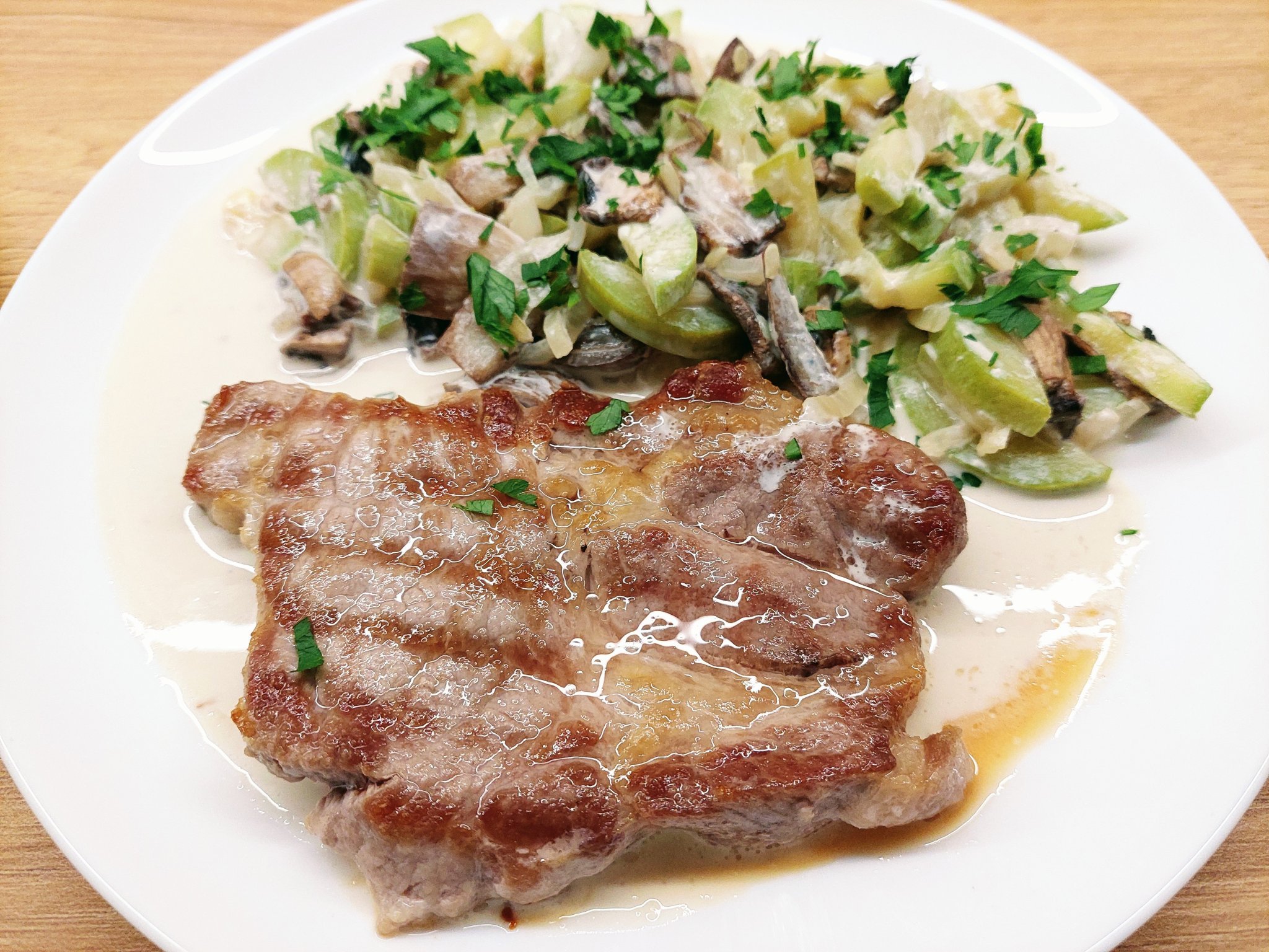 Свински врат и задушени тиквички, лук, гъби и сметана.
