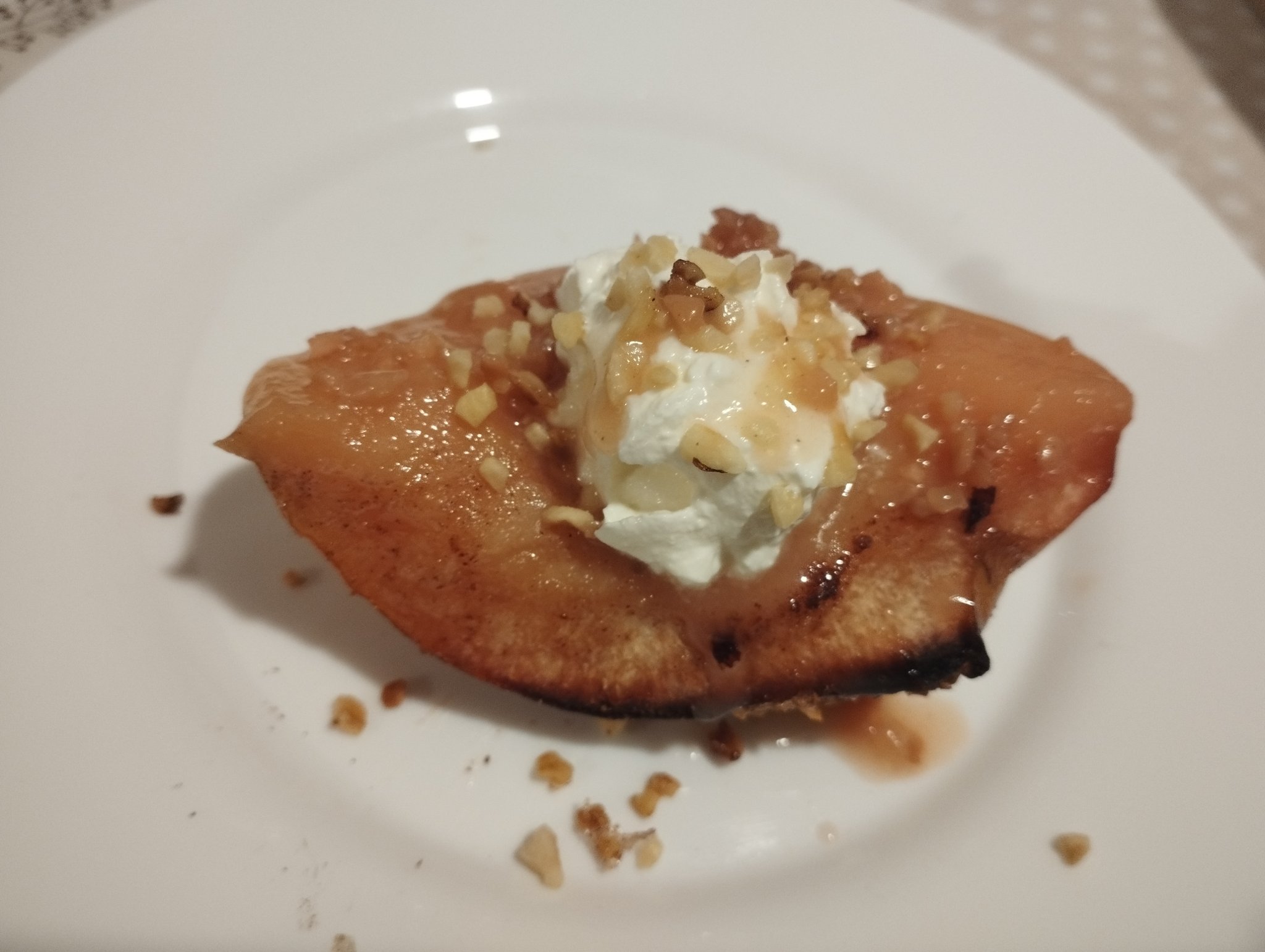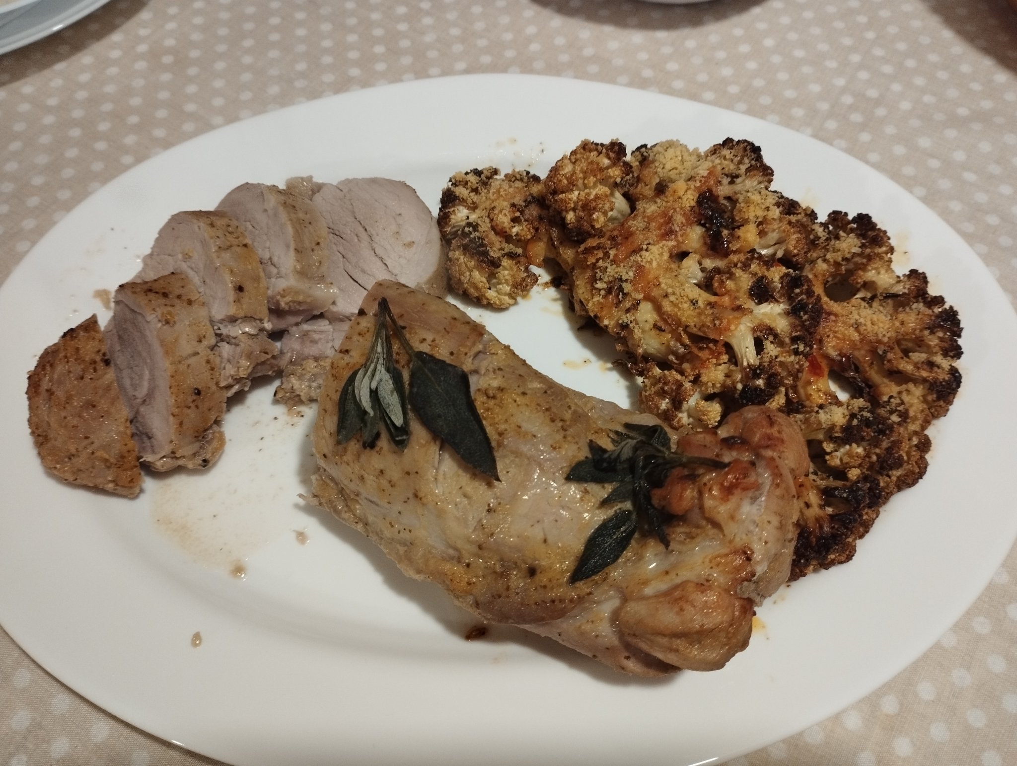 Печено свинско бонфиле, карамелизиран лук и карфиолен стек за компания на едно френско вино. И печени дюли за десерт. Размазахме се от вкусотия!