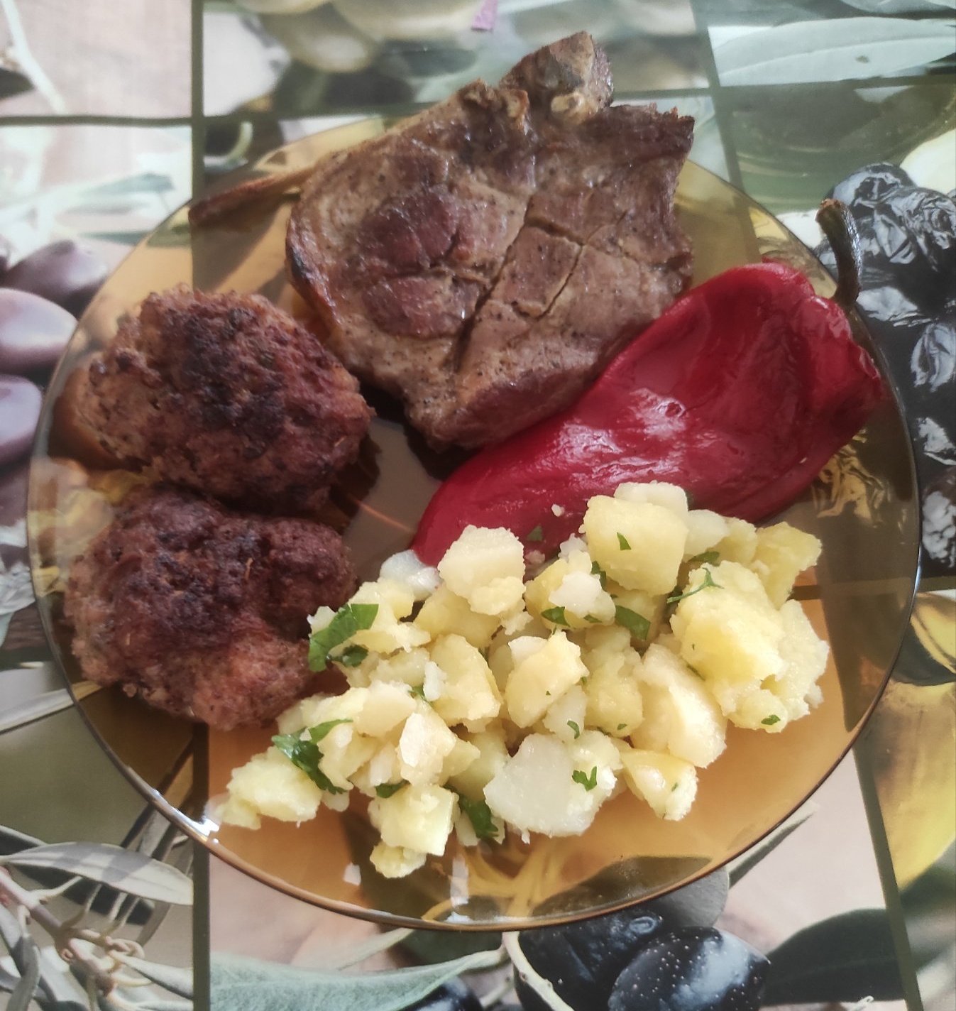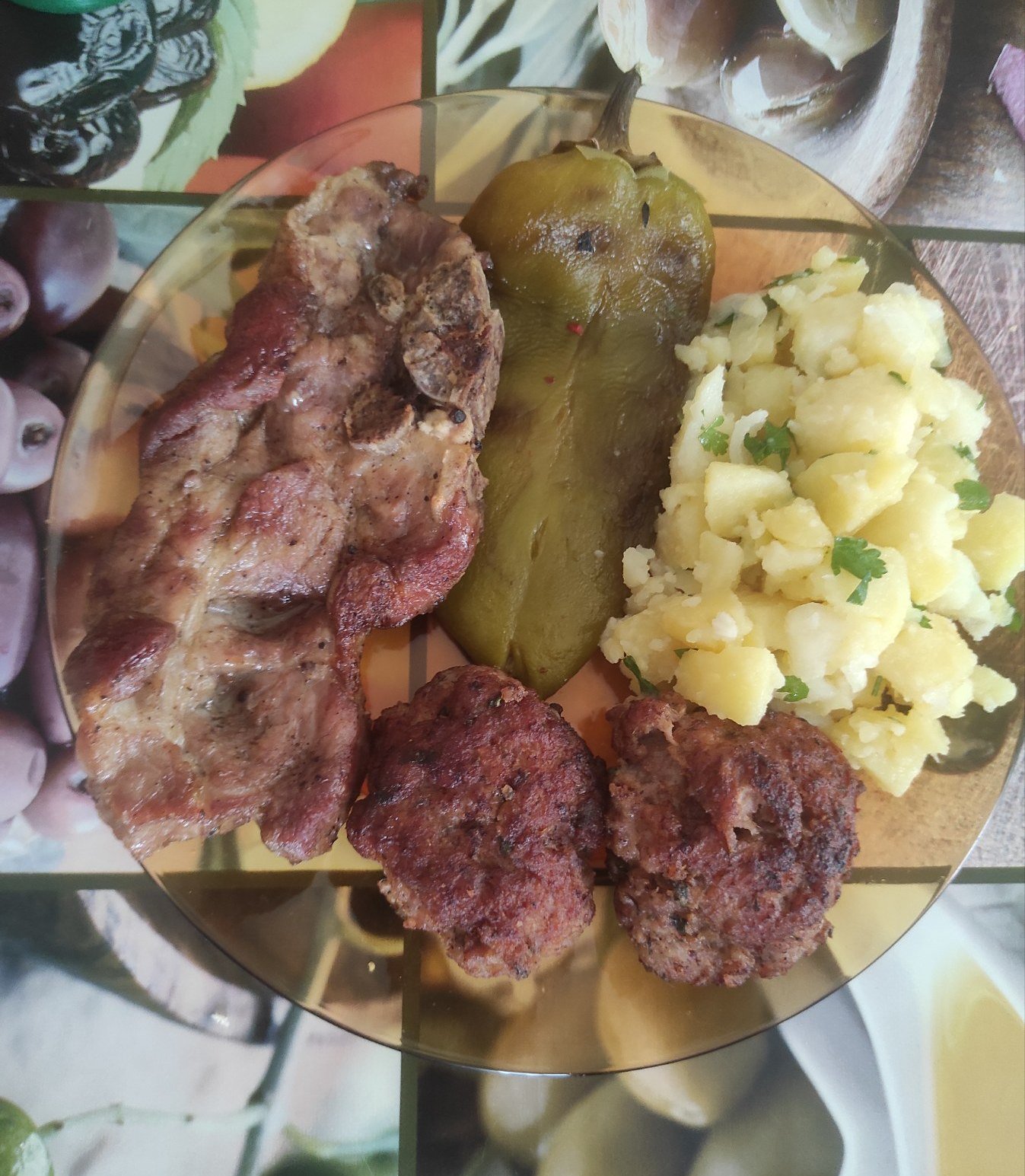 Пържоли на скара, пържени кюфтета, картофена салата и картофено пюре, което не съм снимала.