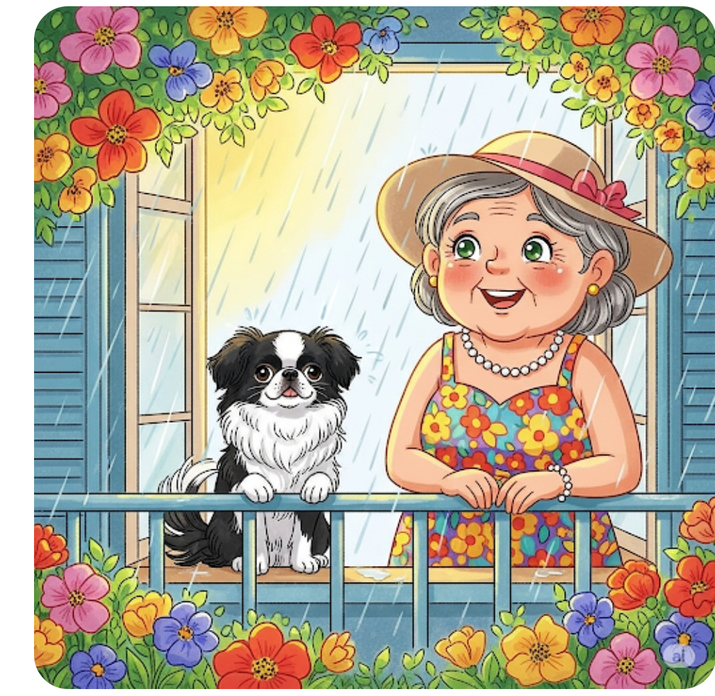 Седим на балкона с Кучо и се любуваме на дъжда. Той е голям любопитко, гушнала съм го на коленете ми, а той протяга шия да гледа навън през парапета и отваря уста да лапа дъждовни капки. И снежинките така ги ловеше, в движение.