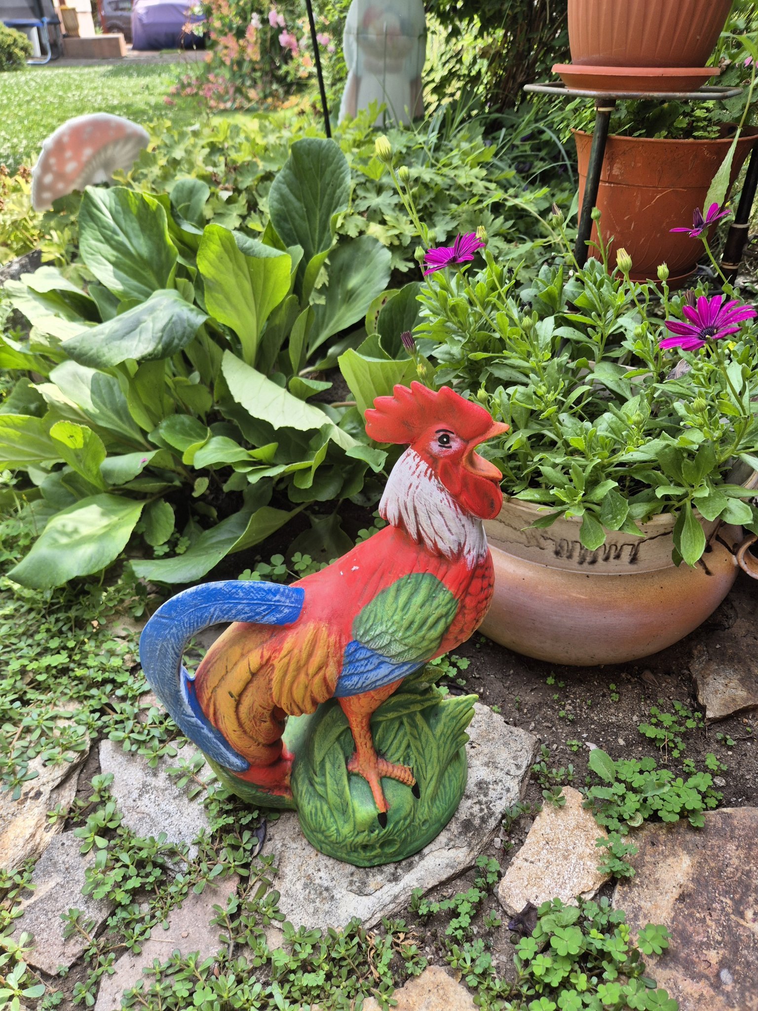 Ще има ваканция пИятелят, с нас беше за 5 нощувки, след няколко дни заминава на Добринище с мама,  после море с тях, после море с нас и другото ще се решава в движение. Забравих да ви кажа, че минавайки през Кресна, човекът поиска да му купя един петел от ,, замръзнал глин,,. Купих го и сега ми краси градината.