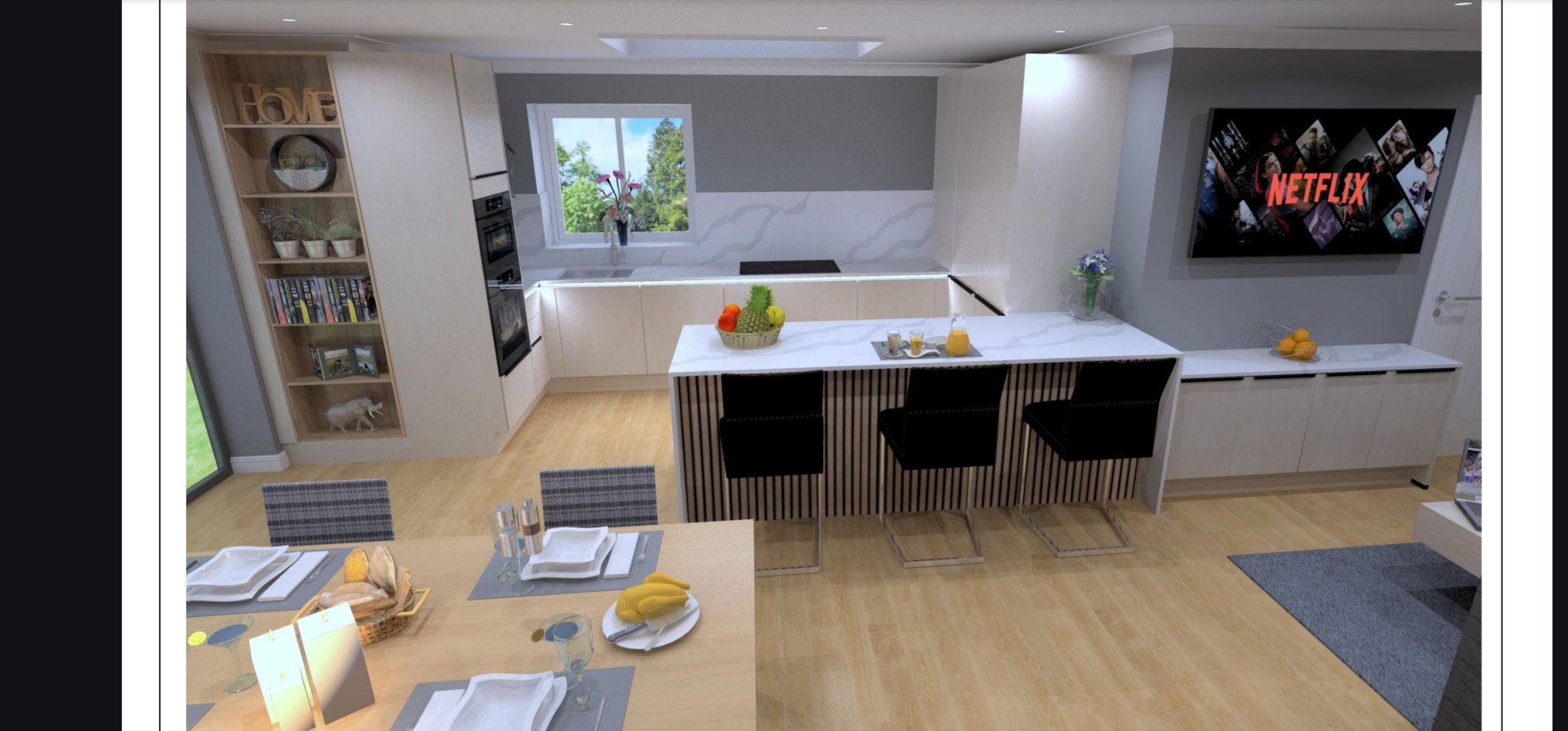 Здравейте, започваме ремонт и ще обедини кухненския бокс и трапезарията. Имам проекта за кухнята, не искам да има горни шкафчета и не мога да реша до къде да е височината на гърба. Идеята е да е от кварц заедно с плодовете, но си мисля че може да го направим и от някакви други плочки.