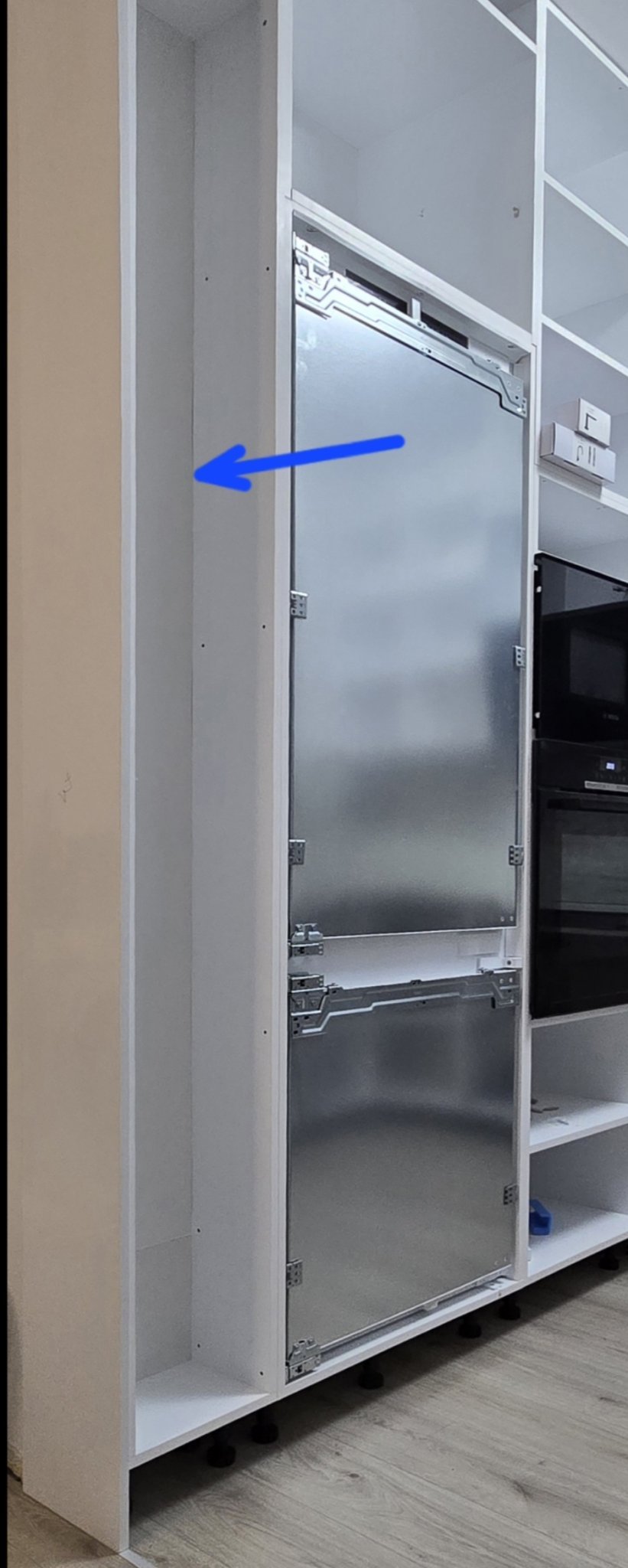 И аз смятам, че е по-добре да се затвори този тесен и висок шкаф с вратичка. Вече вътре - рафтове, според каквото имате нужда да слагате там - буркани, бутилки, консервни кутии, пакетирани храни, дребни неща като допълнителни гъби и т.н., домакински препарати, може дори мопове да се закачат и скрият.