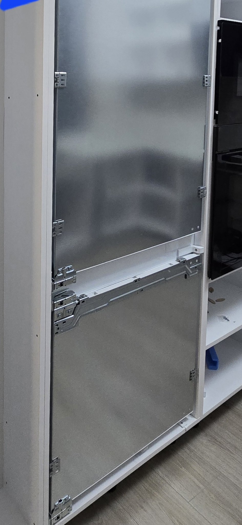 2) Никакви бленди няма да слагам, свободностоящите хладилници имат нужда от охлаждане, препоръчва се 5 см. от всички страни. Дори бих направила шкаф за по-широк хладилник, не стандартните 60 см. ширина габаритни размери, ако някой ден реша да сменям с по-широк. Всъщност точно такъв по-широк хладилник - по спомен 75 см. ширина, при същата височина, си харесах, когато отидох в магазина последния път. Това, което ме спря да го купя, е че бързах и нямах възможност да се занимавам с търсене на хамали да ми го качат 7 етажа по стълбите (нямаше да се събере в асансьора). Затова купих стандартен 60 см.