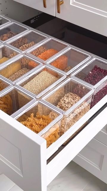Брашна и варива имах в 2 горни шкафа, но не ми харесваше, че трябва да вадя първо предното. Така в чекмедже и кутии ми изглежда по-лесно.