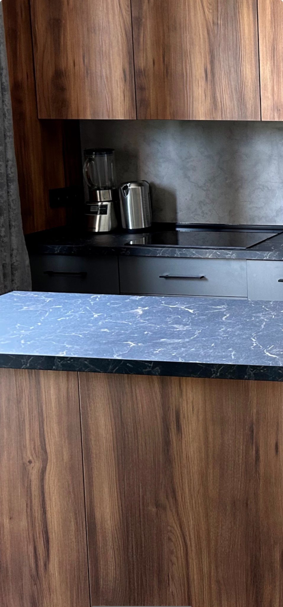 Една кухня имам - горе дървесно ПДЧ на Егер, долу графит.