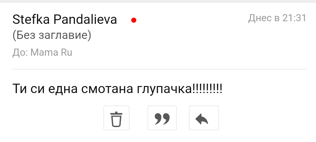 Лично съобщение от потребителка, с която не съм се засичала. Понеже не виждам на лични съобщения опцията "Информирай модератор" ще дам скрийншот тук: