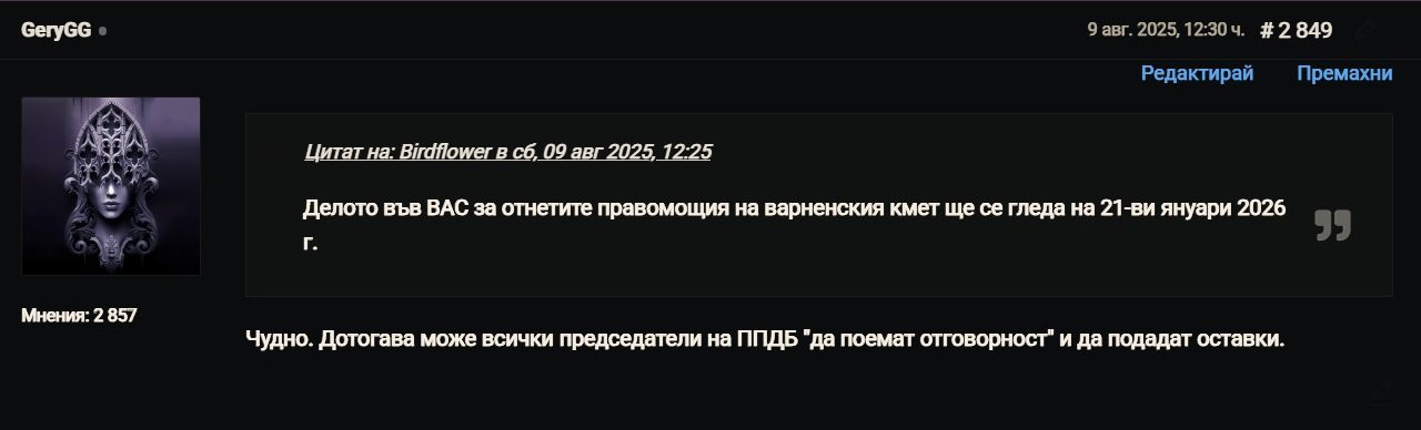 Може ли администратор, триещ мненията в "Политиката в България", да обясни защо заради явните си политически и лични пристрастия и в разрез с кои правила на форума е изтрил следното ми мнение?