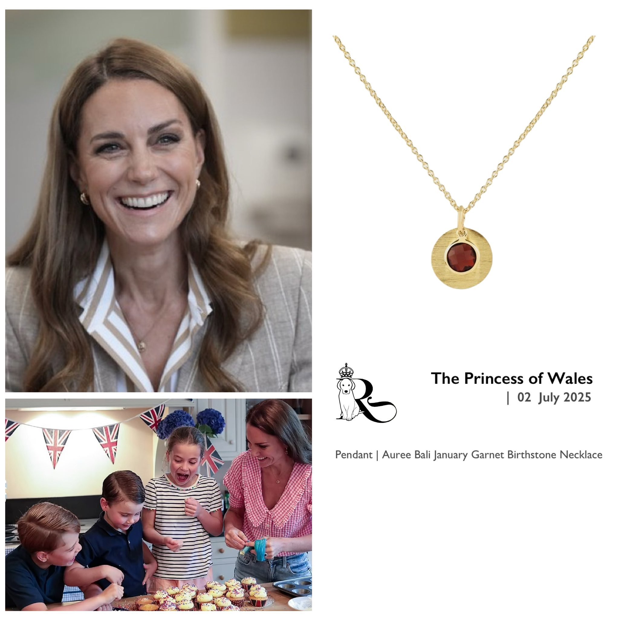 Принцесата на Уелс носи висулката си с балийски камък от бижутерия Auree. Това бижу беше видяно преди това през юни 2022 г. и когато дворецът публикува видеоклип за честването на платинения юбилей с принц Джордж, принцеса Шарлот и принц Луи.