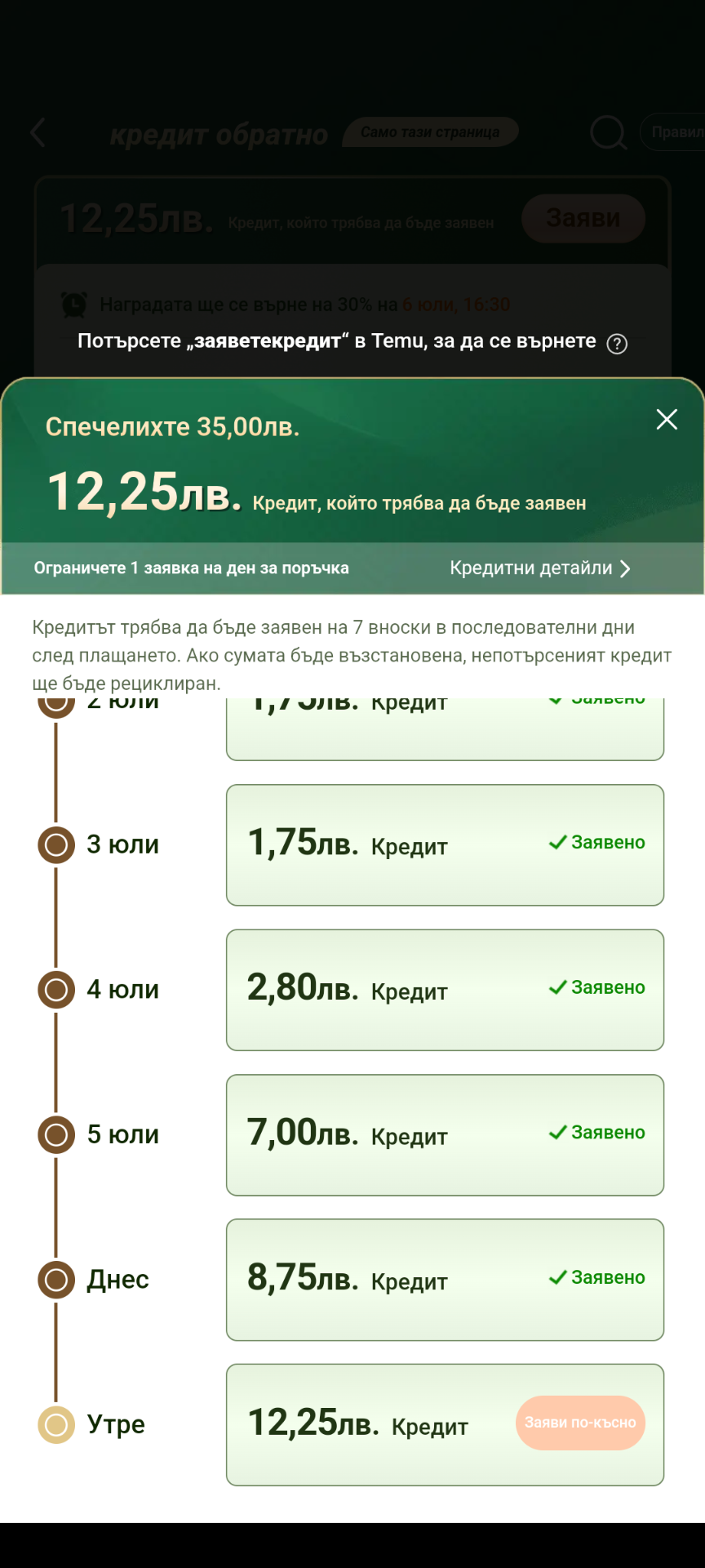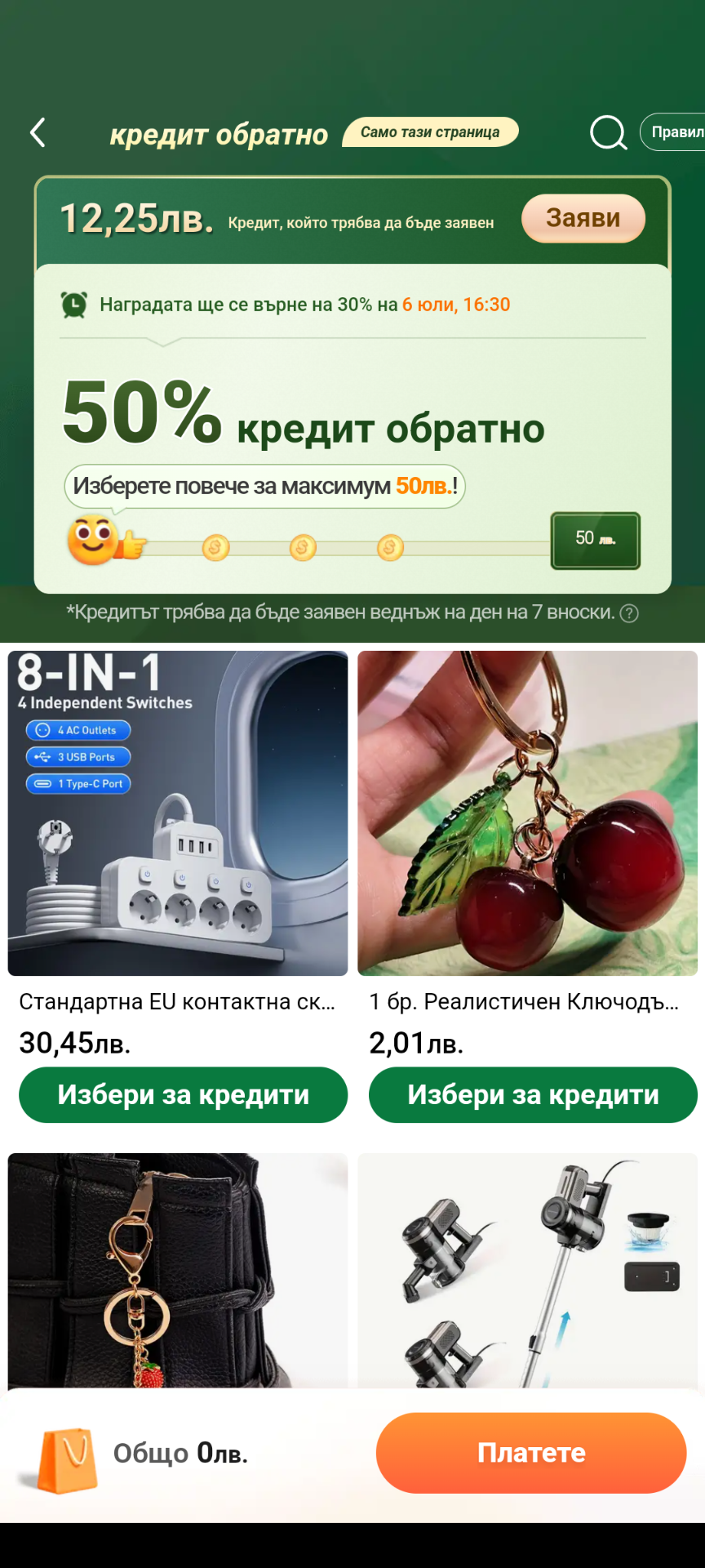 На мене ми върна офертата за връщане на кредит. При всяко подновяване сменя проценти, суми и подобни. Поръчах веднъж, когато искаше да похарча по-малка сума и на следващия път с връщането на кредит ми се видя, че не е изгодно и поръчах използвайки стар купон, който ботът ми поднови (30 лв. при поръчка над 80 лв.). Днес ми дава намаления с 50%, като максималната сума за връщане на кредит беше 50 лв. мисля. Но пък вчера ми намали една от безжичните прахосмукачки от 60 на 39 лв. и затова поръчах.