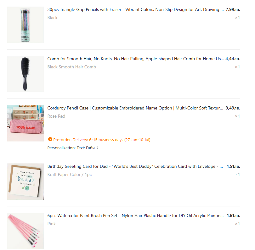 Споделям предната поръчка може на някой да му е полезно. Гледам предимно да набавя някакви неща за училището на детето и са на доста прилична цена.