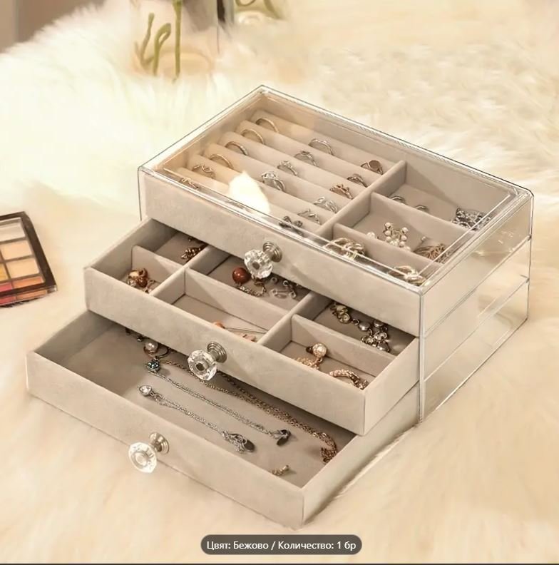 Друга кутия за бижута, но за вкъщи. Писна ми да събирам все малки отделни кутийки и реших да сложа повечето неща заедно в една голяма. Не е лоша на външен вид, дори изглежда донякъде изискана. Иначе си е пластмаса и евтин картон. Пръстени с по-обемни камъни не знам дали биха могли да се поставят на съответното място. Чекмеджетата могат да се разместват, но нямат опора при изваждане. Не знам колко ще издържи, но ще си я запазя. За 8 лв. я взех.