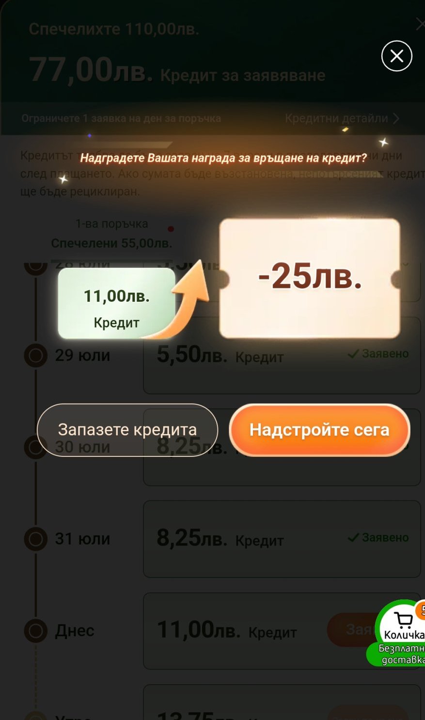 Кратка статистика от мен. На 02.07.2025 последно ми даде креди 65/110 ако помня правилно, който използвах и беше последния път в който направих поръчка. Днес се върна кредита с параметри 27/90, което е разочароващо. По-добре е от нищо но не съм сигурен дали ще поръчам каквото и да е, може би ако успея да го препокрия и с други промоции…