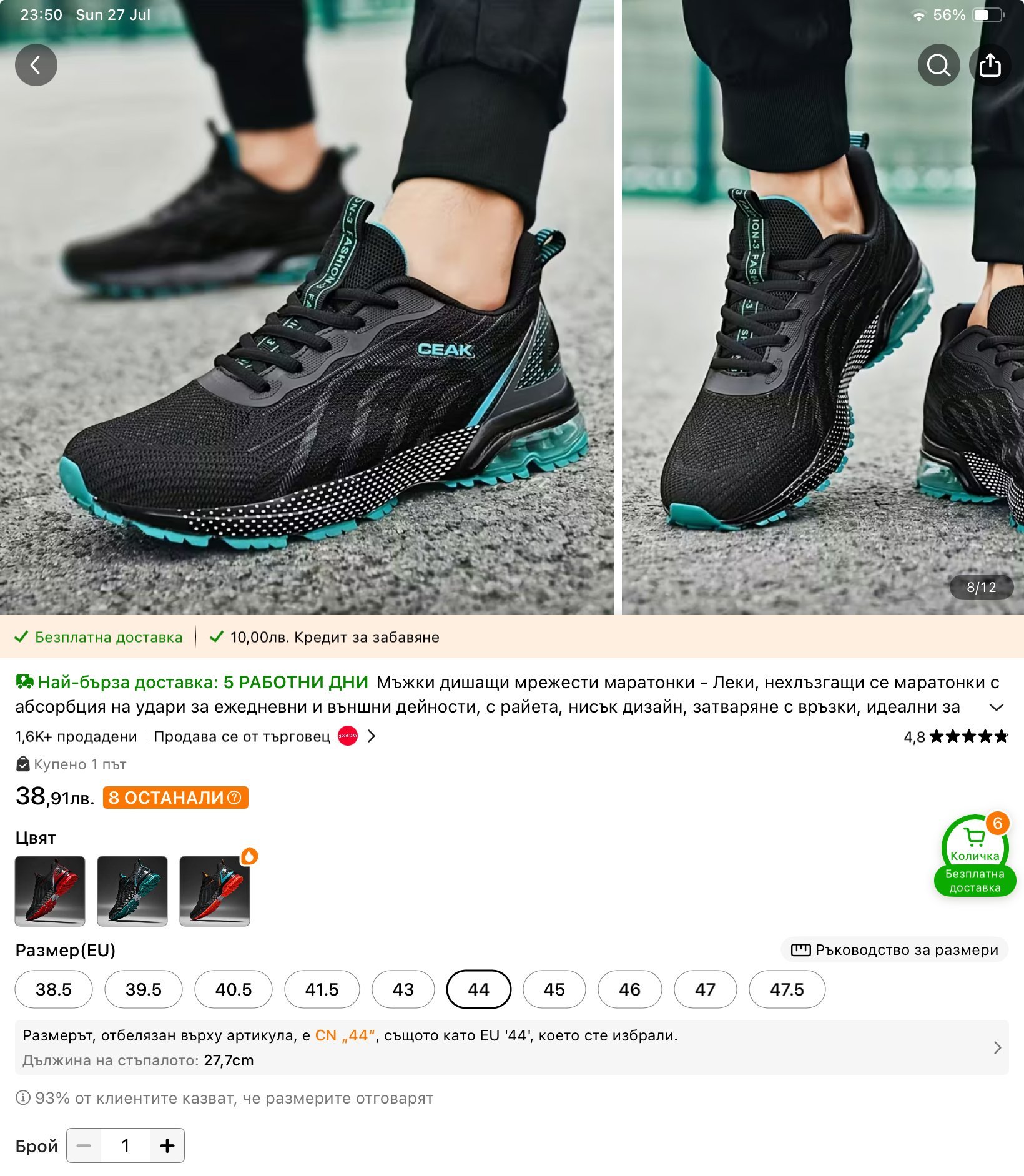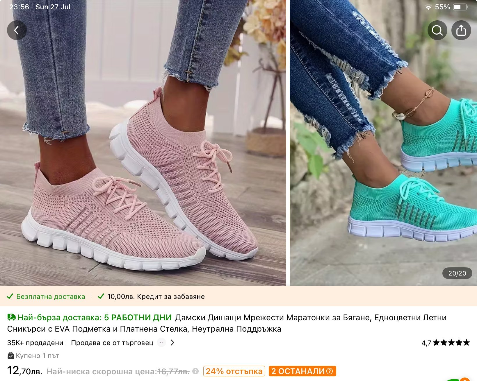 Тези маратонки дори не помня да съм ги поръчвала. Големи са ми, но са удобни. Явно при мен 36.5 отговаря на 37. Аз съм поръчала 37.5 което е по-скоро 38