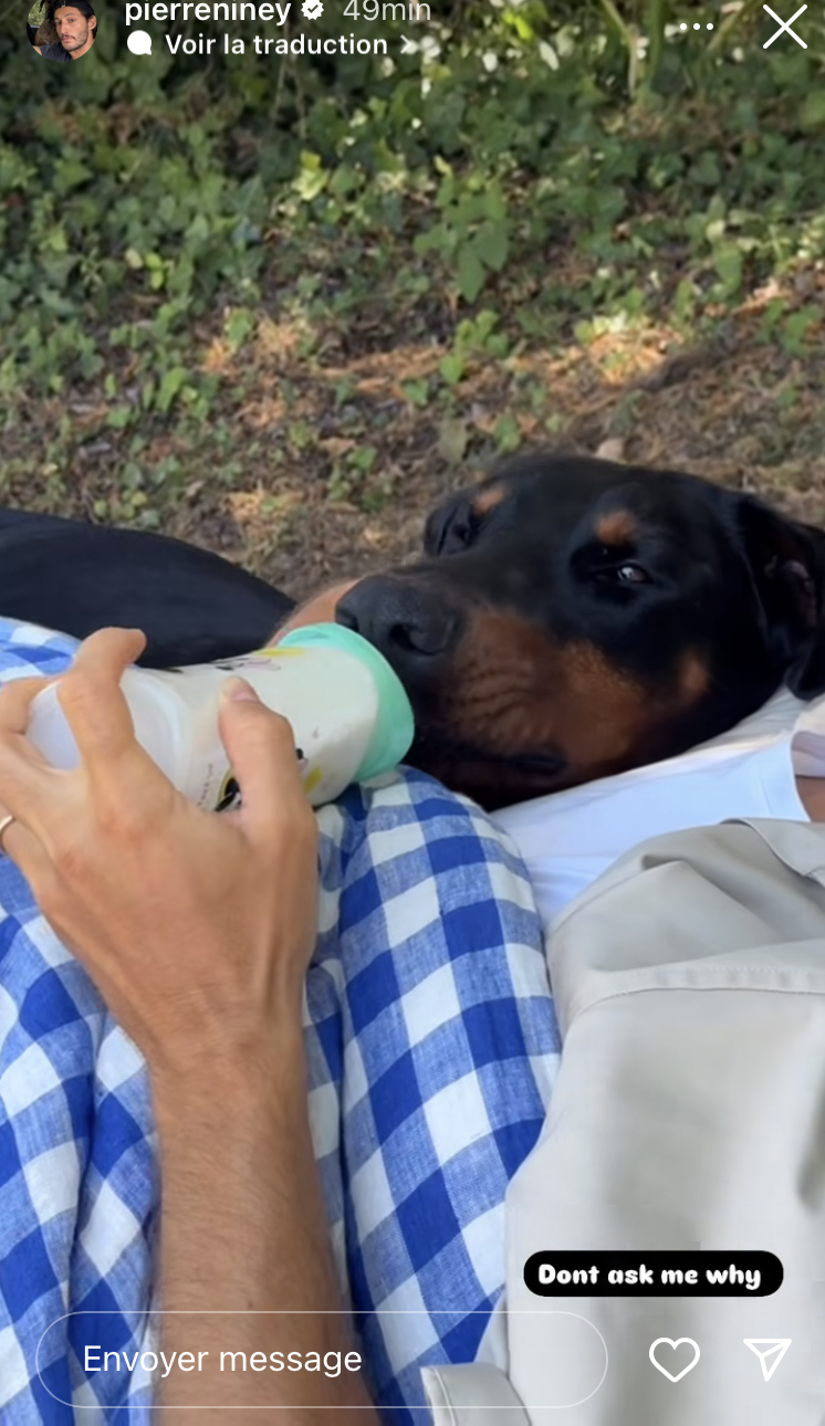 И Пиер Нине, така успешния Граф Монте Кристо на Дюма, с кучето си, което храни с биберон.