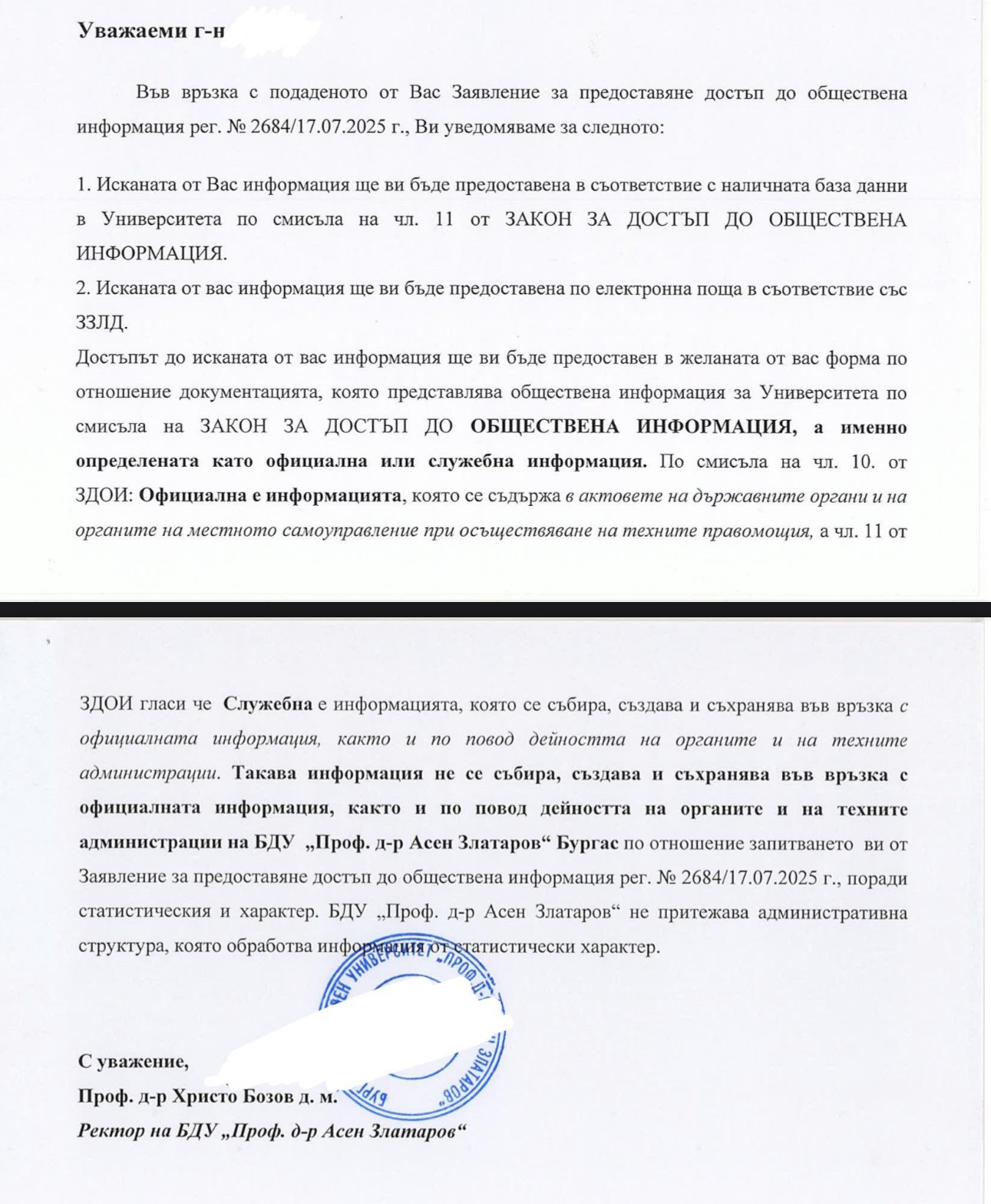 Поисках информация по ЗДОИ за минималните балове в Бургаския държавен университет. Сигурно съм тъп и не разбирам достатъчно, но хем ми казват, че ще ми дадат информация, хем ми казват, че не събирали такава. Laughing
