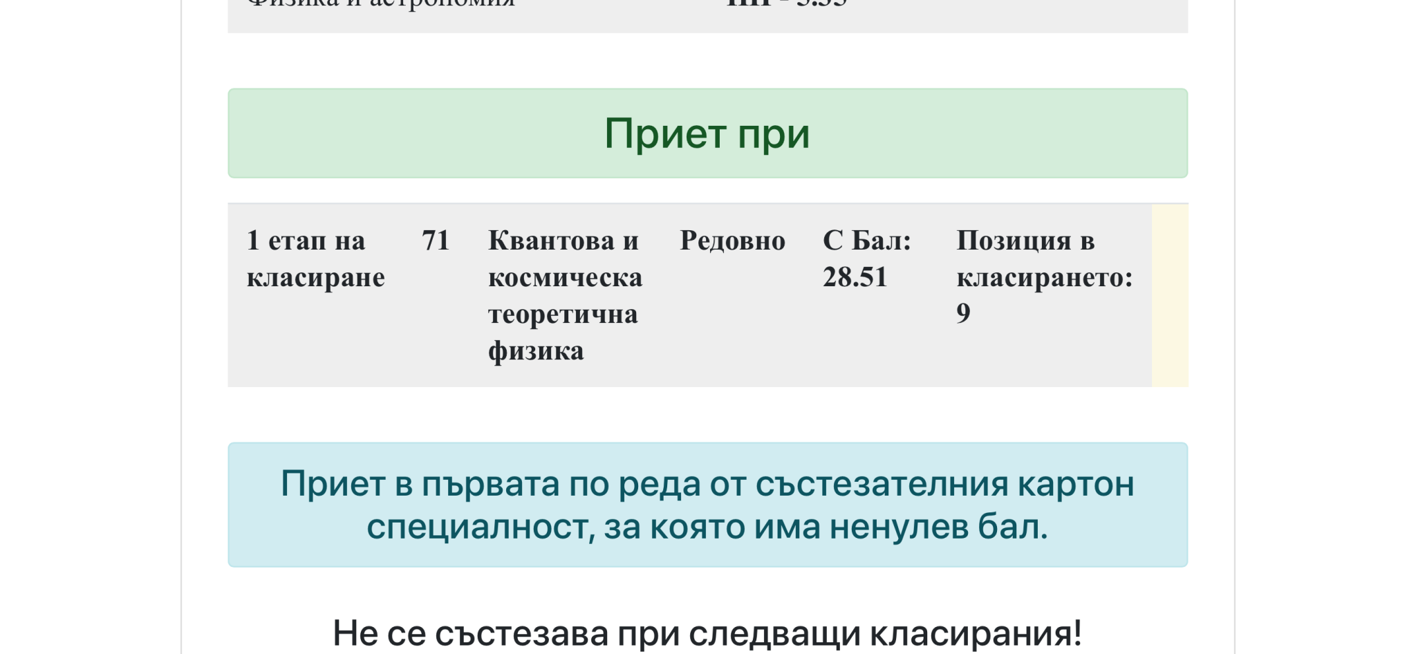 Приета в единствената специалност за която кандидатства в СУ. Честито на всички със сбъднати желания.