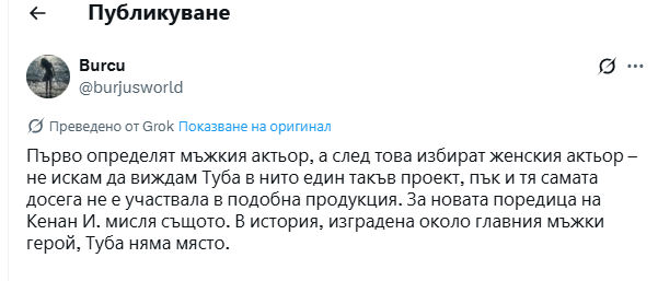 Нямам нищо против актьора, но не искам Туба отново в мъжки сериал. Надявам се, че слуховете за  преговори по този или друг ТВ проект да не са верни!