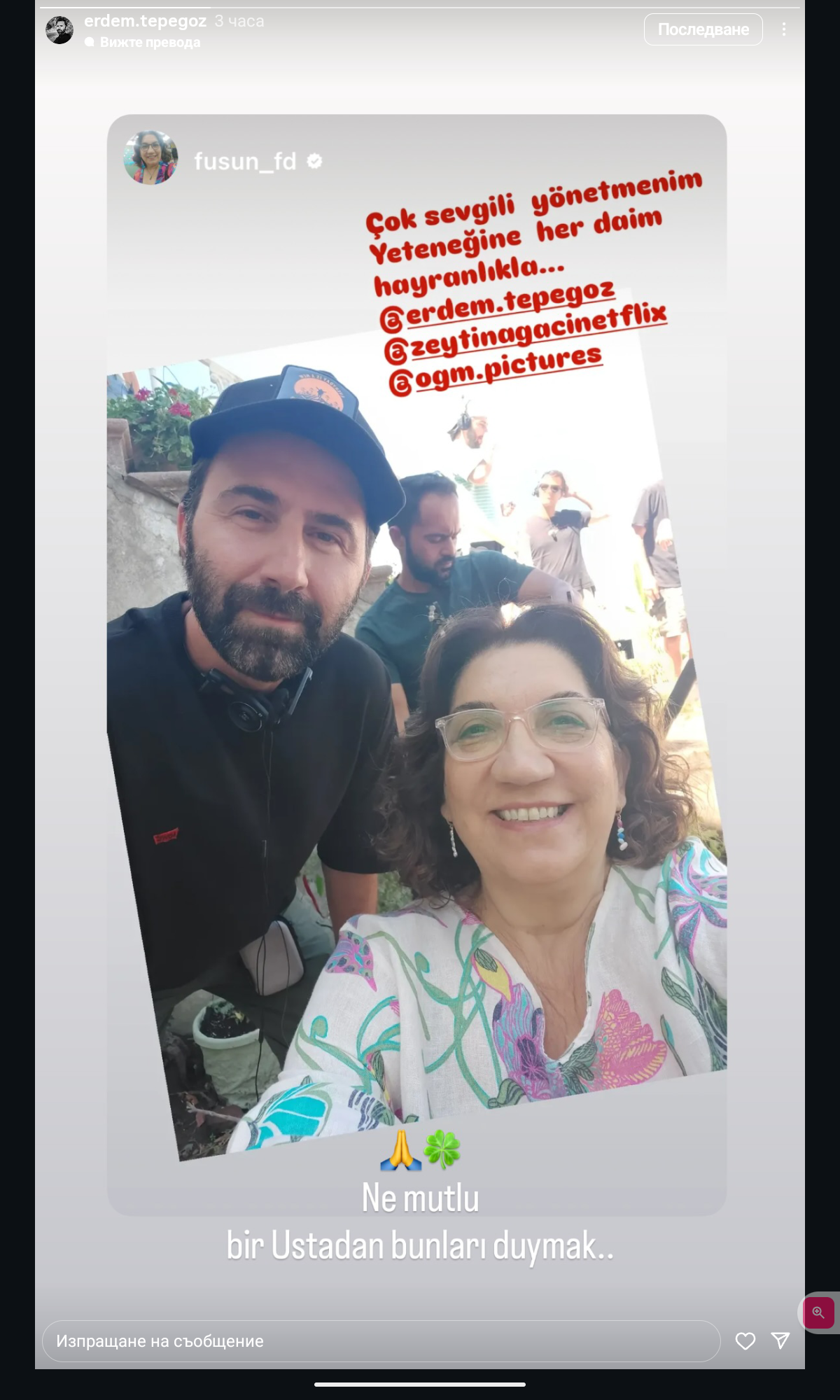 „Когато красиви хора се събират, това не е просто снимка, това е спомен. Моментът, в който талантът и грацията се съчетават. Умут Курт и Туба Бююкюстюн.“