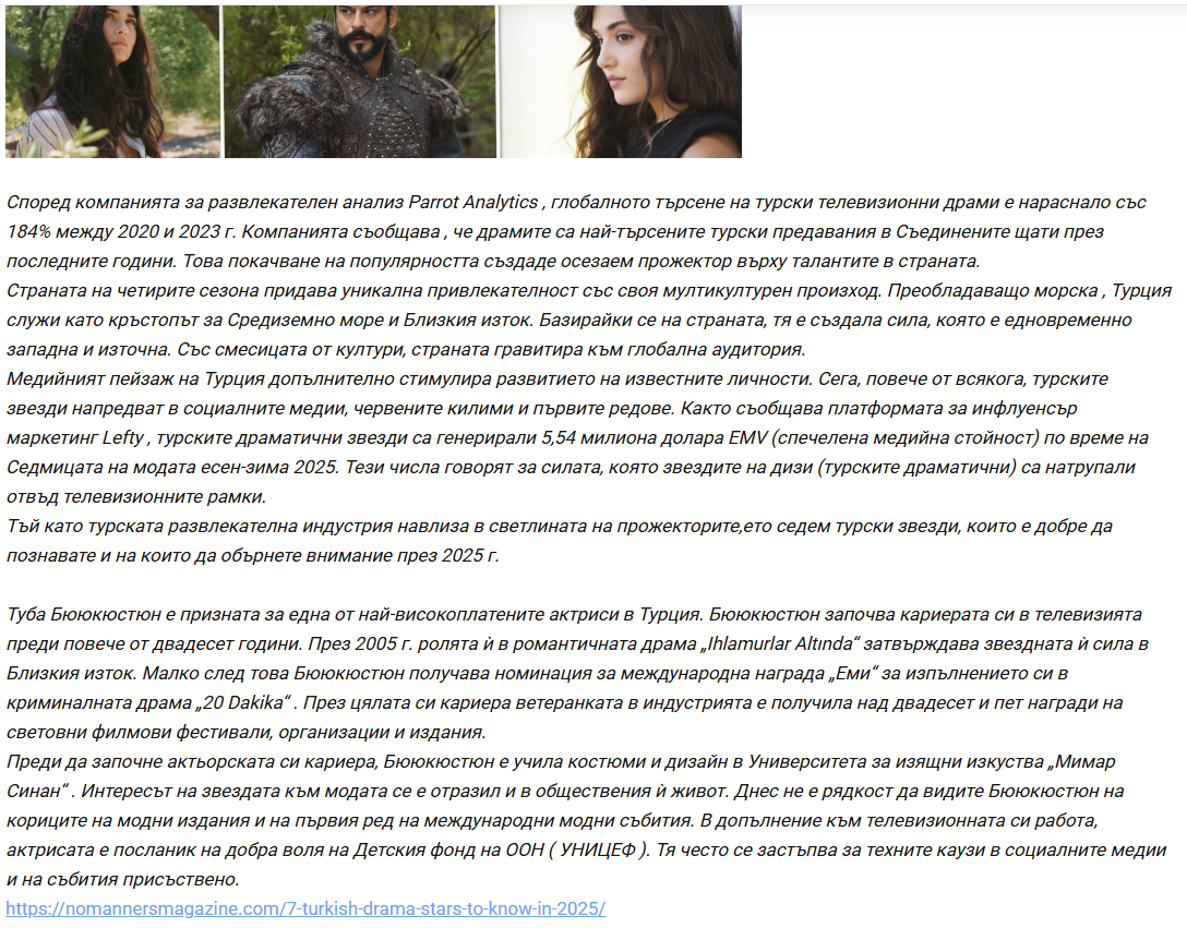 Тъй като турската развлекателна индустрия навлиза в светлината на прожекторите,ето седем турски звезди, които е добре да познавате и на които да обърнете внимание през 2025 г.