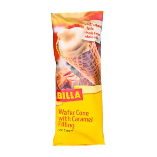 Сладолед с марка Билла с вкус на ванилия и вътре с крем от горски плод. Има различни видове с фунийка от 120 грама. Италиански е.  Купуваме за втори път и ще си купим отново със сигурност.