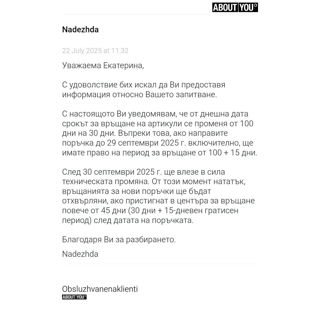 Днес изпратих запитване за информация от кога важи новият срок за връщане. Това е отговорът: