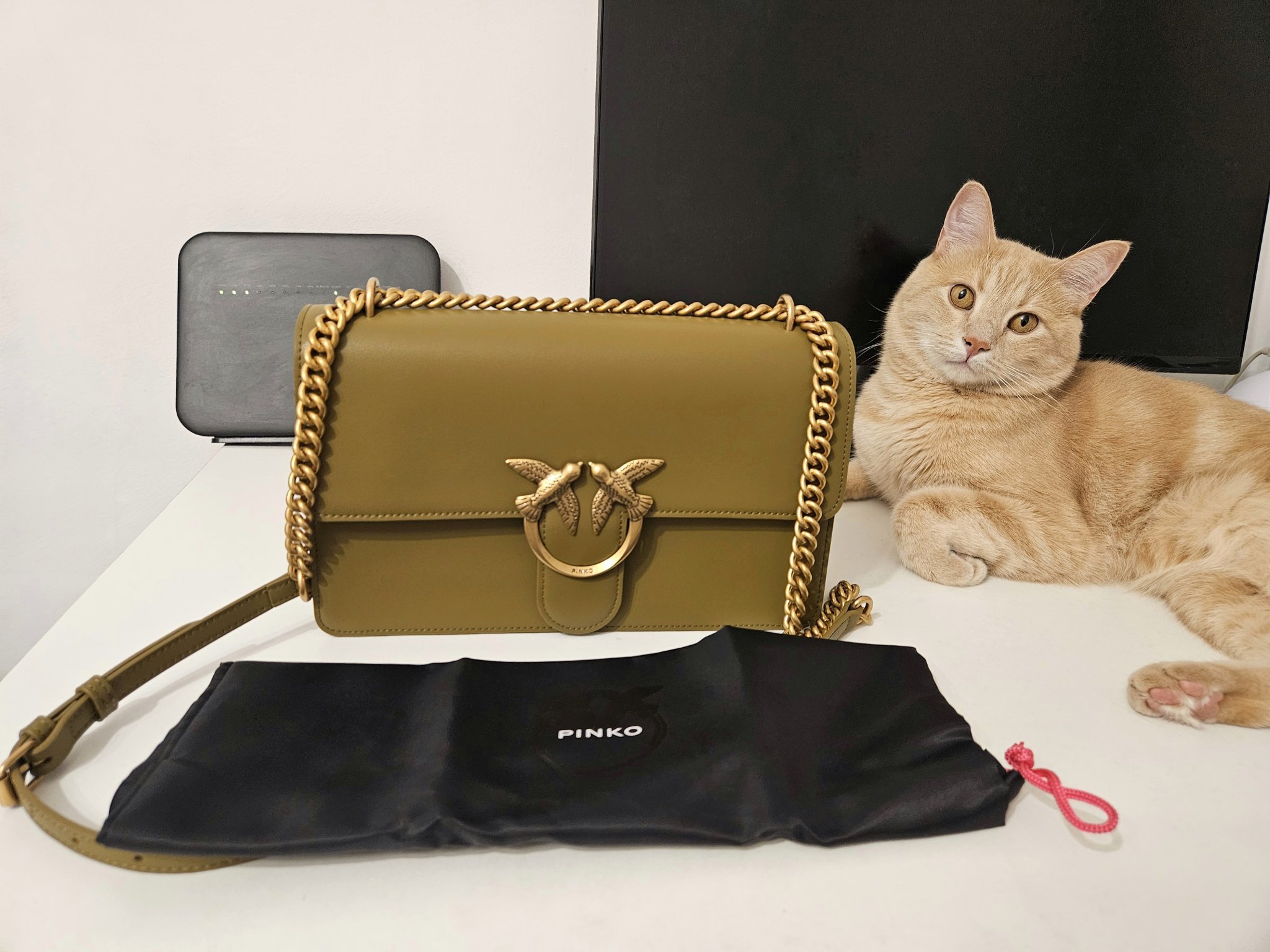 Получих си чантата Pinko от аутлета и много ми харесва: https://aboutyou-outlet.bg/p/pinko/chanta-s-prezramki-love/27148917 Сега е скъпа, като поръчах беше на много добра цена за чанта на марката от по-големите, обикновено намаляват само най-дребните. Тази е 27см, с разделение с цип вътре, има си всички сертификати и талонче да я регистрирам. 280лв излезе. Дойде в собствена отделна кутия на марката и цялата покрита със защитна опаковка, 5 минути разопаковах. 🙃 Чудна е, много й се радвам. Котаракът също я одобри и не можах да го убедя да ме остави да я снимам без него. Но пък помага за ориентиране какъв е цветът на чантата на живо. 😂 В сайта е малко по-тъмен на снимките.
