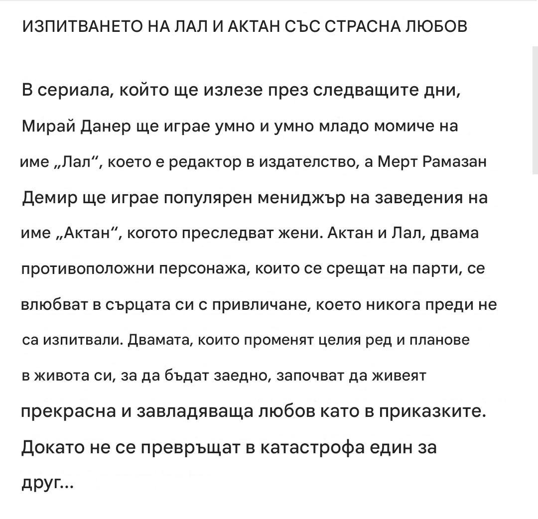 В сериала, който ще се снима през следващите дни, Мирай Данер ще играе умно и блестящо младо момиче, което работи като редактор в издателство „Лал“, а Мерт Рамазан Демир ще играе популярен мениджър на заведения на име „Актан“, когото преследват жени. Актан и Лал, които се срещат на парти и са двама противоположни персонажи, се сливат сърца с привличане, което никога преди не са изпитвали. Дуото, което променя всички редове и планове в живота си, за да бъде заедно, започва да живее прекрасна и завладяваща любов като в приказките. Докато не се превръщат в бедствие един за друг...
