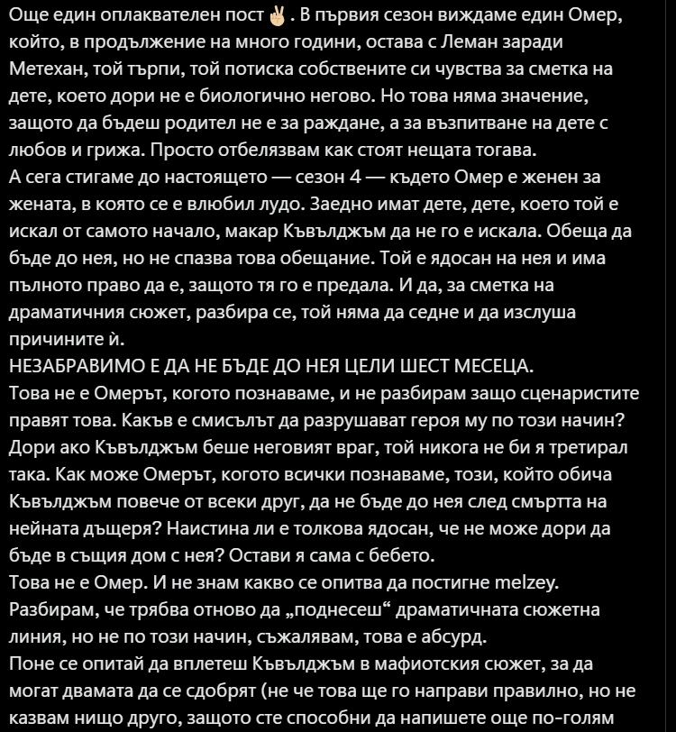 Колкото и да ме боли за тях, но тя си го заслужаваше. Омер сега няма да и обръща внимание и ще държи дистанция между тях , ще бъде груб с нея, но заради бебока ще трябва да я вижда по един или друг начин. Това нещо не се прощава бързо. Ще мине време, но събитията ще бъдат трудни за нея. Със смъртта на Доа тя няма да има упората на най-важния човек за нея извън Сьомнез и децата й.