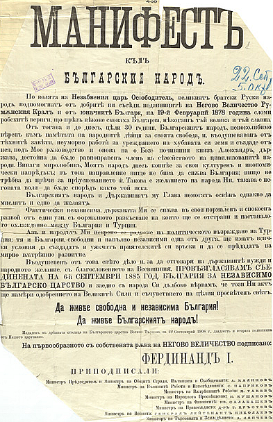 България става независима държава на 22 септември 1908 г. На този ден в църквата „Св. Четиридесет мъченици“ във Велико Търново княз Фердинанд обявява независимостта на България от Османската империя и приема титлата „цар на българите“. На този ден страната ни става равноправна сред европейските държави.
