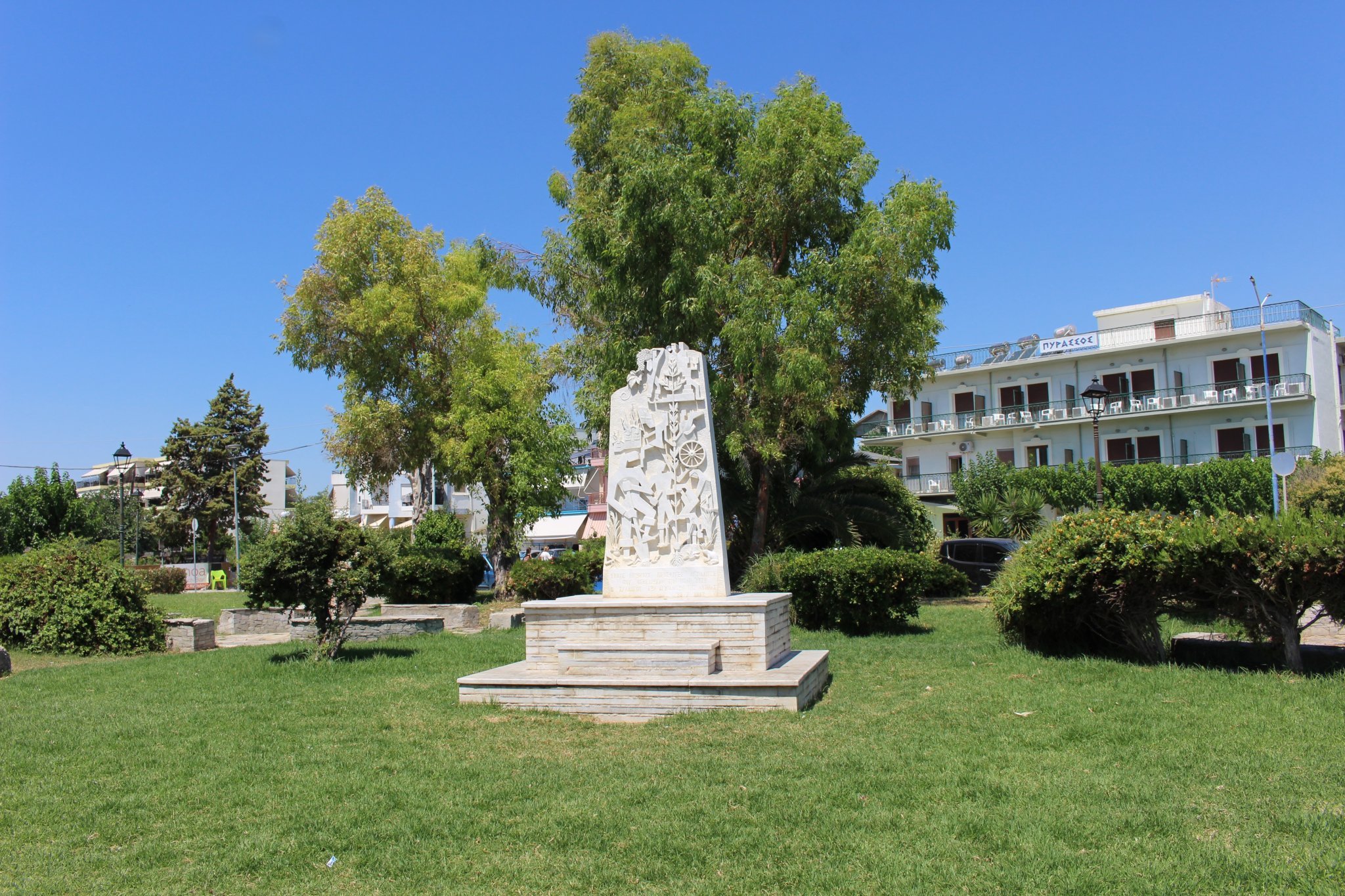 И ние обичаме да спираме попътно на връщане в България, но предпочитаме да е място с плаж. Тази година след 9-годишно отлагане решихме да се отбием в Неа Анхиалос - намира се на 20 км. преди Волос. Причината за посещението е сантиментална, защото градчето е основано в началото на 20-ти век от българи (или гърци), бежанци от Анхиало (дн. Поморие) след опожаряването на града през 1906г. Сред тези анхиалци е имало и роднини на съпруга ми, който пък е роден в Поморие. Най-близките му роднини са се върнали в България впоследствие, но се оказа, че и там има останали далечни братовчеди, които обаче не бяхме подготвени да търсим.