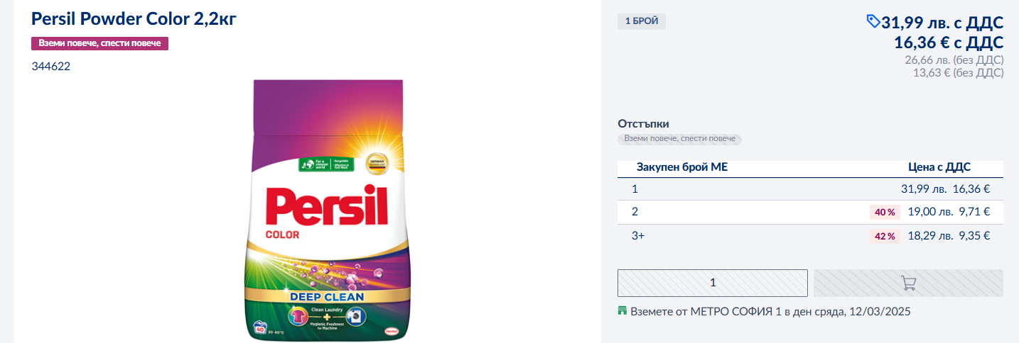 Харесвам и ползвам предимно Персил за цветно пране. Вчера взех от Метро три броя от този на изгодна, според мен цена: 40 пранета за около 19лв.