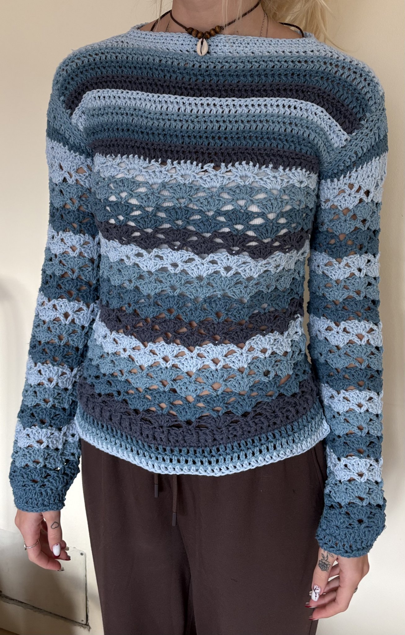 С тази блуза се мъча от месец - два пъти и разплитах ръкавите, докато ми харесат. Дропс рециклирана е, стана доста тежичка.