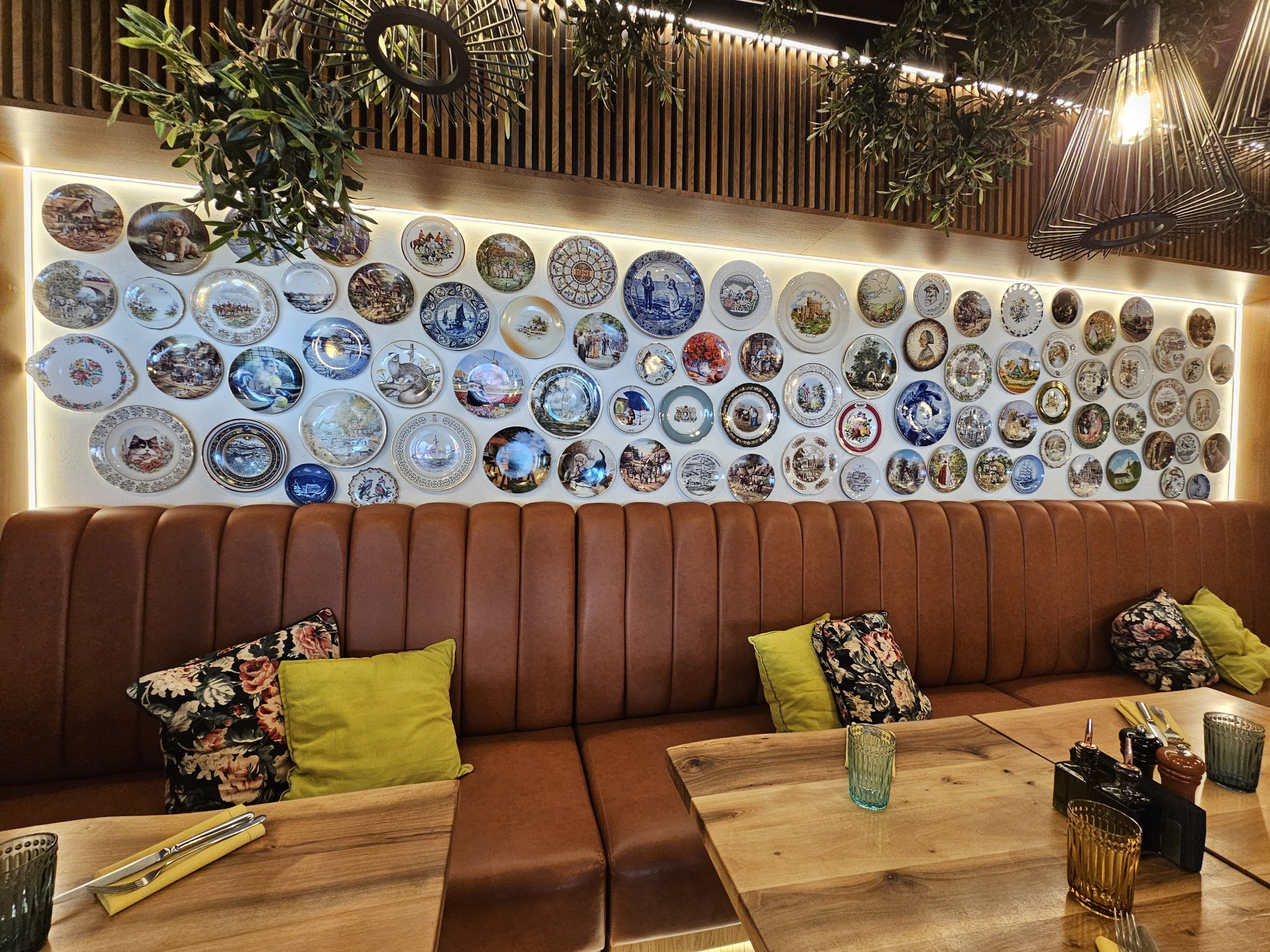 Имат интересна колекция чинии по стените. Снимах само едната стена.