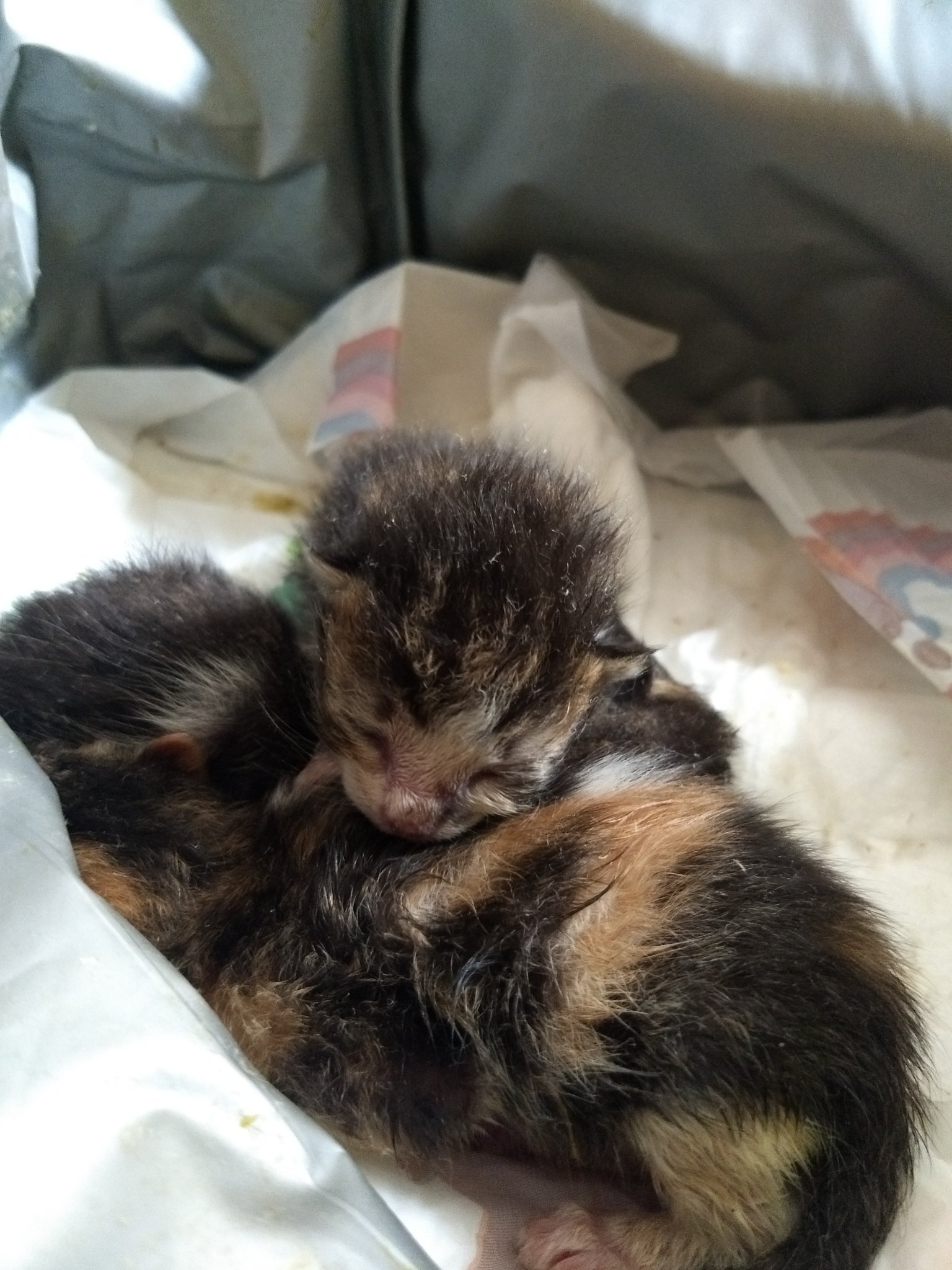 Една топка новородени (засега само на топка дават да ги снимам). Две момичета и едно момче били (по последно поглеждане). Имена: Баунти, Туикси и Сникърс.
