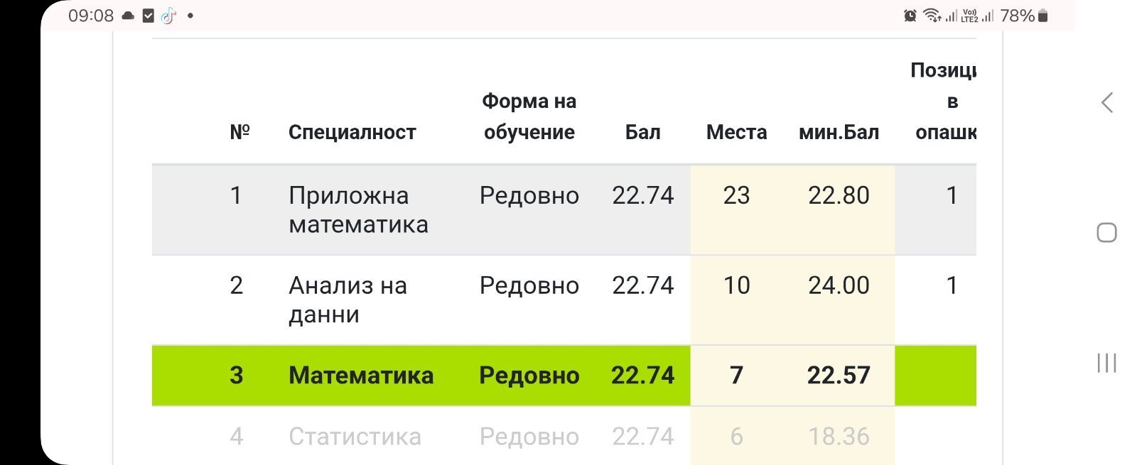 Моето момиче е прието на първо класиране в СУ - Математика. Ще чакаме второ класиране за специалност Приложна математика или Анализ на данни. Първа резерва е и много се надява да бъде приета в по горно желание.