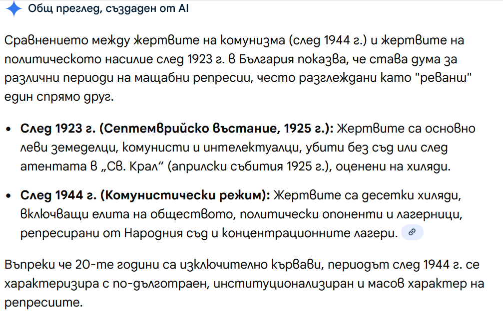 Никой никога не е казвал, че САМО комунистите са правили това. Казваме, че комунистите многократно са превишили действията на предците си. Погромите след септември 1923 година силно бледнеят пред убийствата след септември 1944 година. Не ми се рови по линкове и пробвах лесното - ИИ да обобщи:
