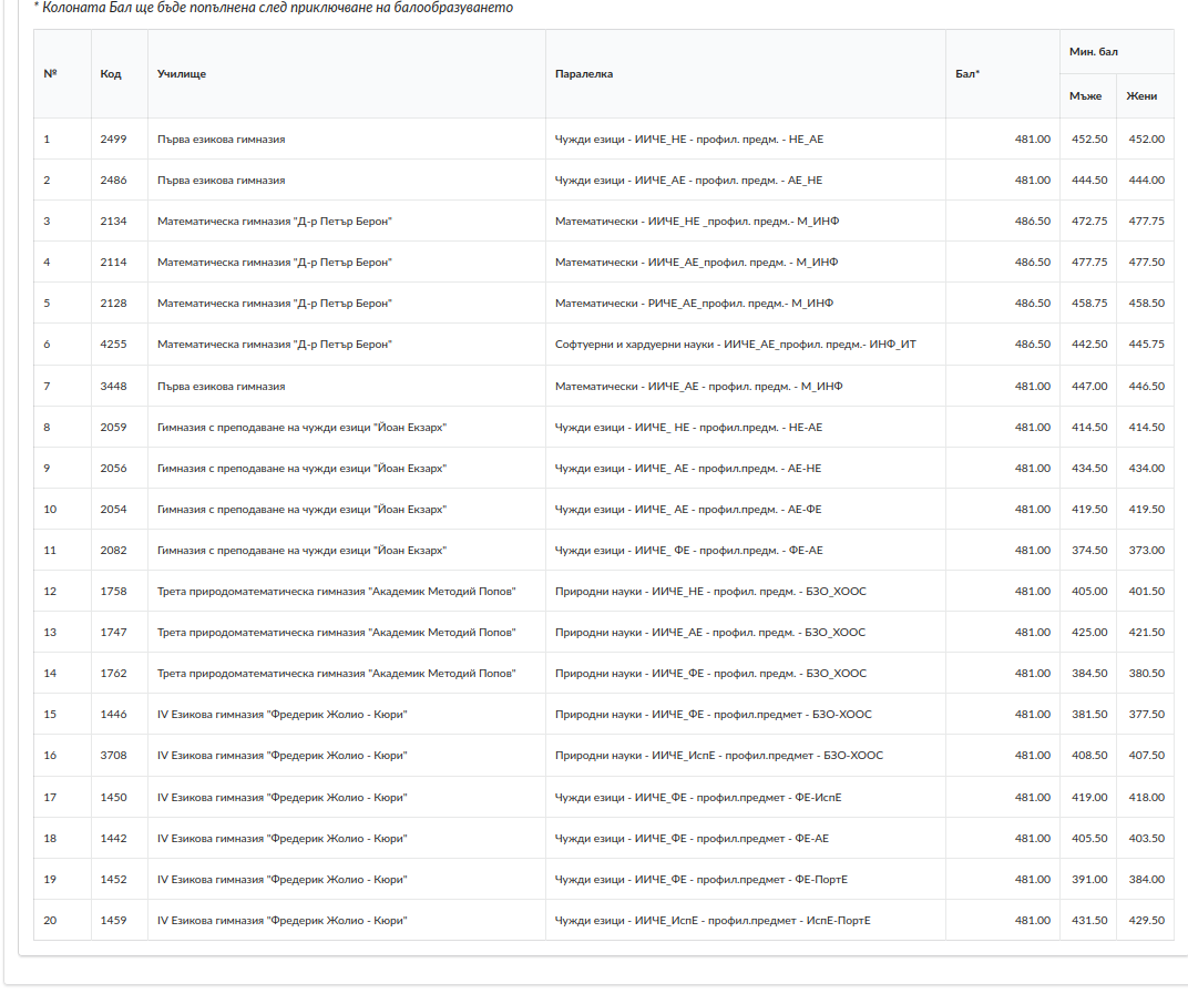 Шумен, Езикова гимназия, при премахната една езикова паралелка /НЕ+АЕ/ тази година и промяна в балообразуването /от 2*БЕЛ+2*МАТ тази година е 3*БЕЛ+1*МАТ/, минималният бал е още по-нисък от миналата година.