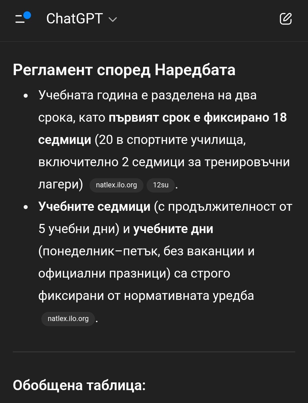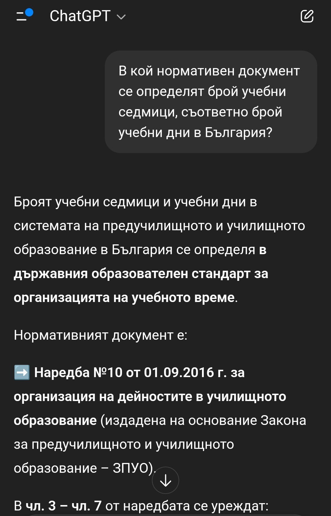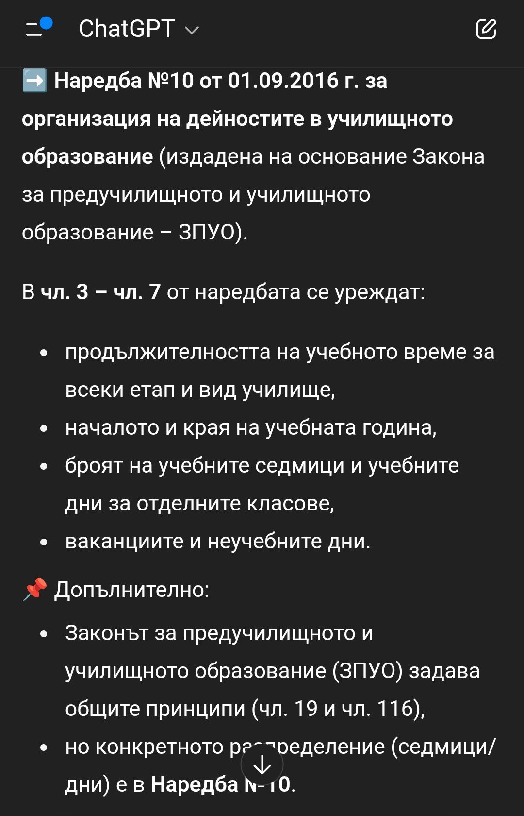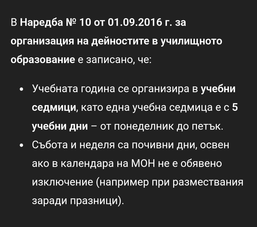 Къде са разписани тези 36 учебни седмици или 180 дни? Законът казва единствено, че учебната година се състои от 12 месеца и започва на 15 септември. Всичко останало е възложено на министъра да определи - частично с наредбата за организация на дейностите /която определя само първия срок - 17 или 18 седмици/ и частично със заповед, с която се определя продължителността на втория срок.