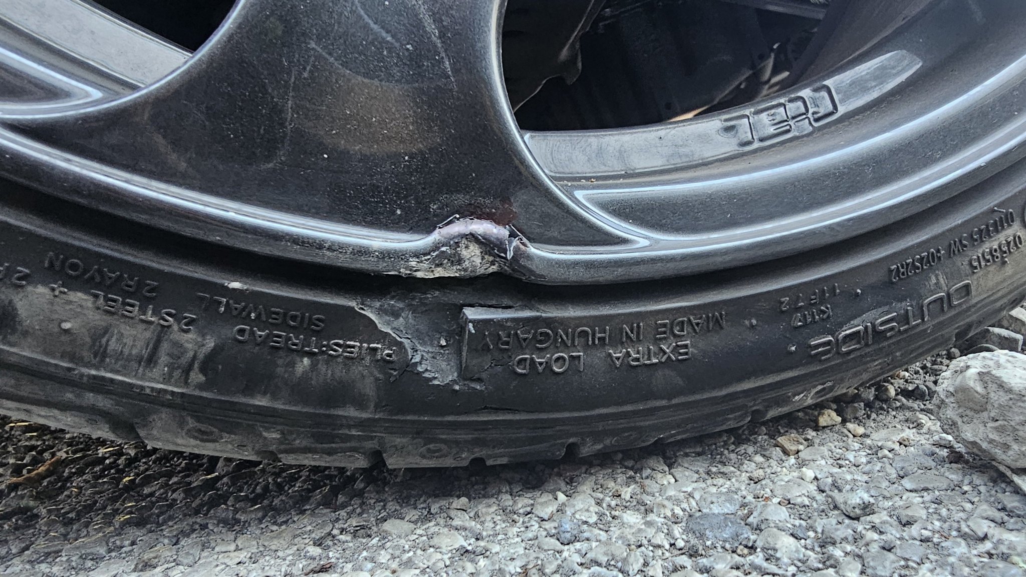 Остави джантата, виж си гумата на първо време. Не можеш да караш с такава гума, едва ли ще издържи. Доста голям удар е било това.