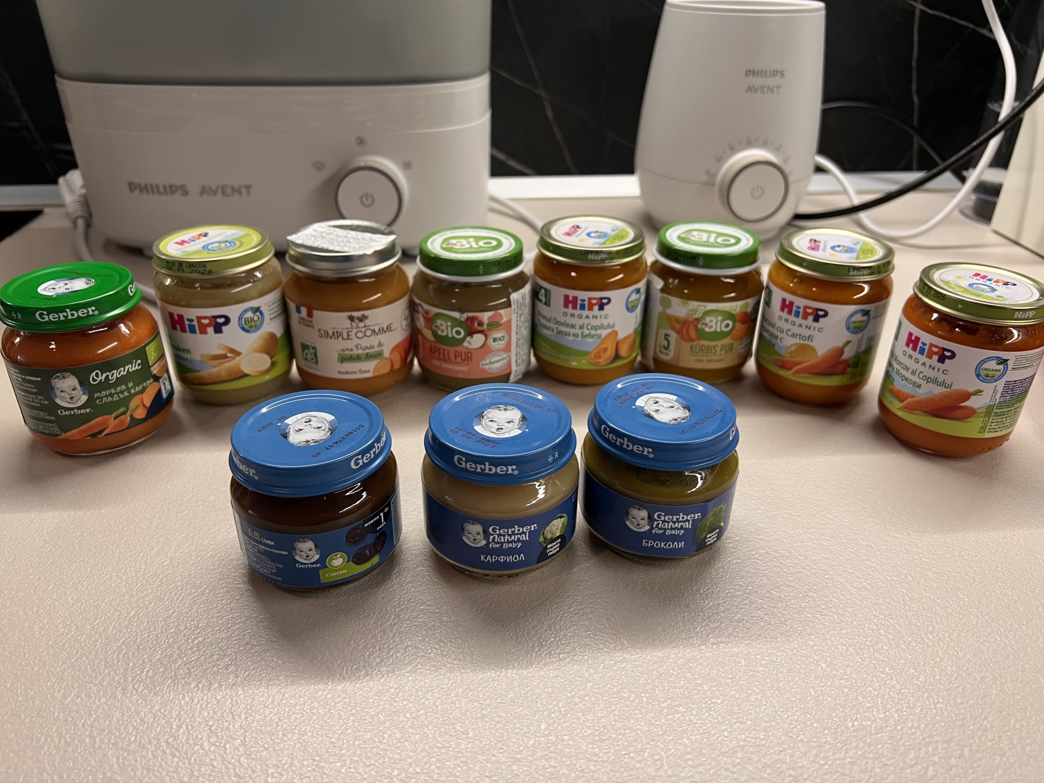 Тези пюренца взех за начало. Четете етикетите, понеже на Hipp в някои плодови има захар, а в зеленчуковите нишестета. Не във всички, мисля, че в броколите и карфиола.