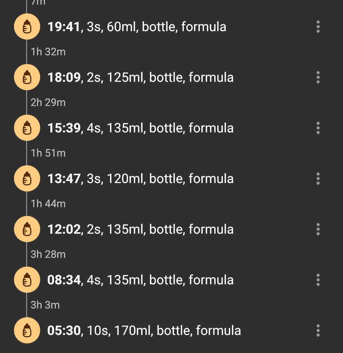 В 3 сутринта - 90, в 6 сутринта - 180, после в 10, в 13, в 16, в 19 и в 22 часа. Имаше един кратък период с по 6 хранения на 4 часа, амааа... с тъга си спомням за него. Отделно си продължава да се буди на всеки час нощем, понякога по няколко пъти, давам биба - плюе я. През деня той е свежарка обикновено, нямаме големи драми с дневния сън - обикновено на 3 дремки с вариация от 25 мин до 2 часа понякога, общо за деня му се събират ок. 3-3.5 часа дремки.